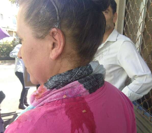 Desde una vivienda de la calle José Vélez arrojaron huevos a los integrantes de la comitiva, uno de los cuales alcanzó a Rosa Vega, secretaria de Comunicación de esta formación en el municipio.