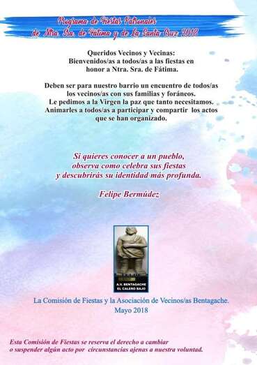 La Asociación de Vecinos Bentagache, que preside la concejala Gloria Cabrera (CC), ha diseñado un programa para contentar a todos los públicos. De ahí que en los días siguientes al pregón de la activista social y vecina del sector de La Montañeta se sucederán actos como el XI Concierto de Música Pop Rock y Noche de Humor con Los Lola, La Última Llave y Omayra Cazorla (sábado 5 de mayo a las 22.00 horas), el encuentro de mujeres previsto para el 10 de mayo, la romería ofrenda del sábado 12 de mayo y la procesión religiosa del domingo 13 de mayo por la tarde, después de la misa de las 19.30 horas.