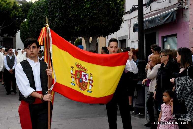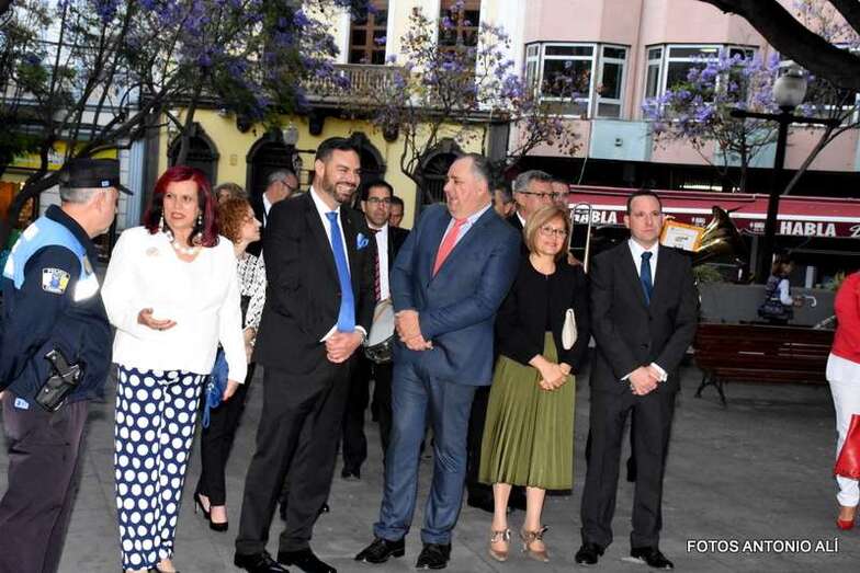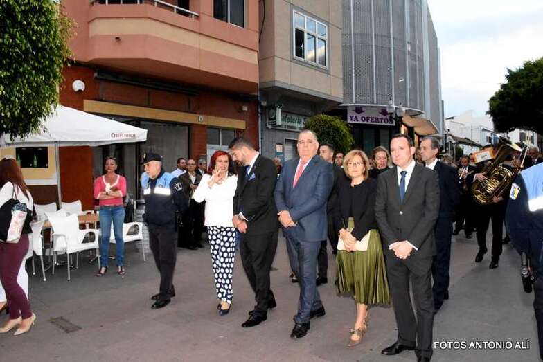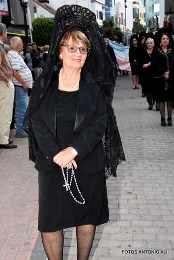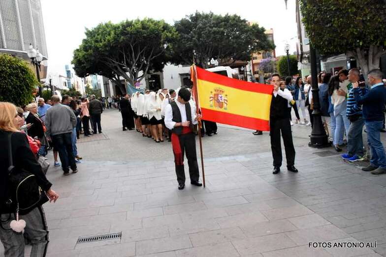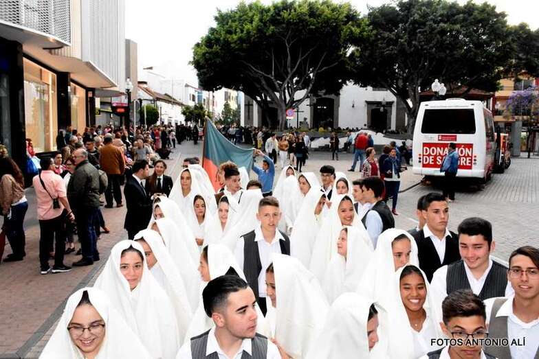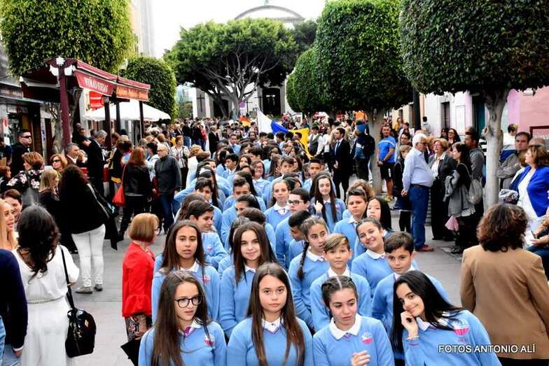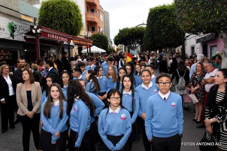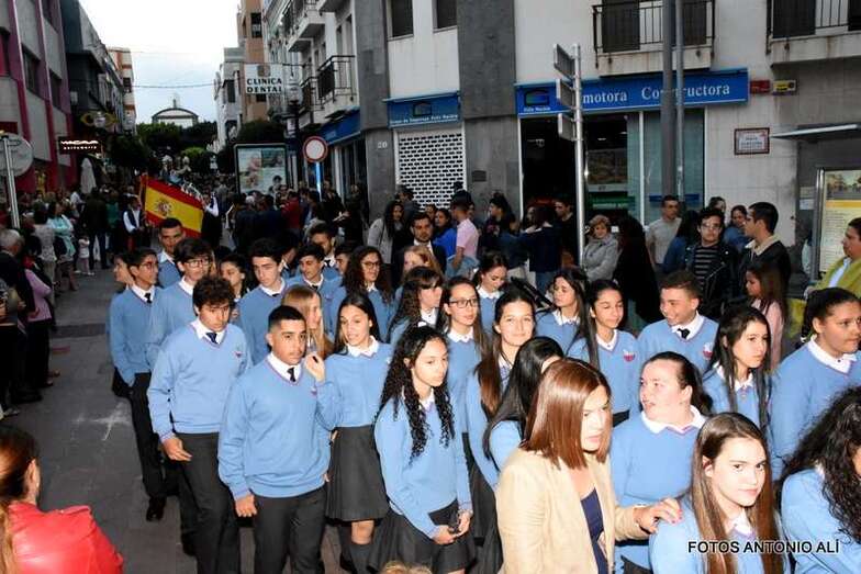 La Banda Municipal de Música y una representación de autoridades municipales acompañaron el desfile que abría un grupo de estudiantes de ambos sexos y de antiguas alumnas con mantilla española.