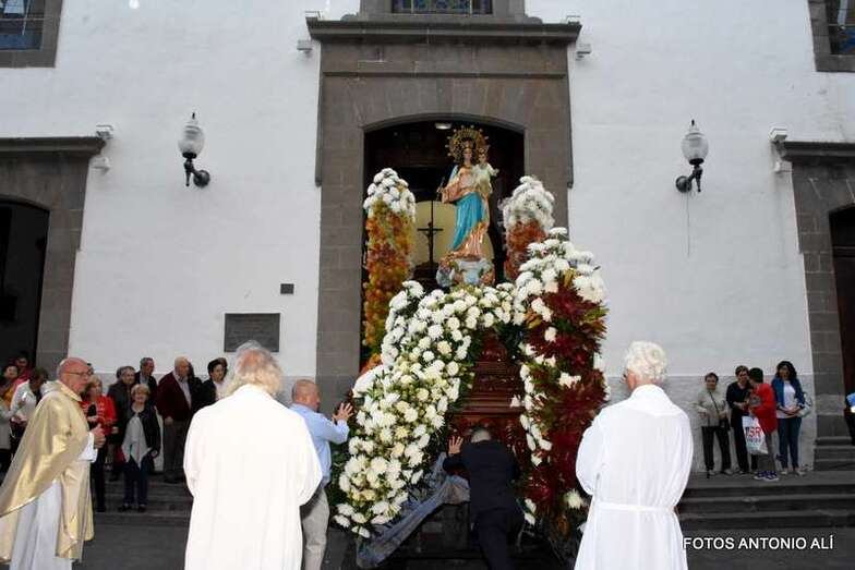 Tras el recorrido de costumbre, la imagen entró en el centro educativo salesiano por la puerta por la que se accede al patio desde la calle de El Salvado, momento en los que allí presentes se prodigaron en vítores y aplausos. La Banda Municipal de Música de Telde interpretó su himno y el alumnado de 4º de la ESO se despidió cantando y danzando una malagueña.