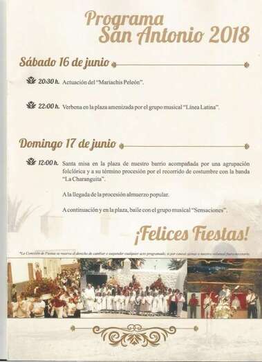 El programa continuará con los actos los días 3, 10, 13, 16 y 17 de junio, jornada en la que tendrá lugar una misa en la plaza pública y posterior procesión por las calles del barrio.