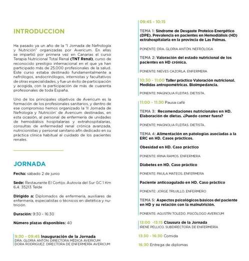 Uno de los principales objetivos de Avericum es la formación de profesionales sanitarios, y por este motivo, esta jornada está dirigida al personal de enfermería de unidades de hemodiálisis, nutricionistas y personal sanitario dedicado al cuidado de los pacientes con insuficiencia renal crónica en Gran Canaria.