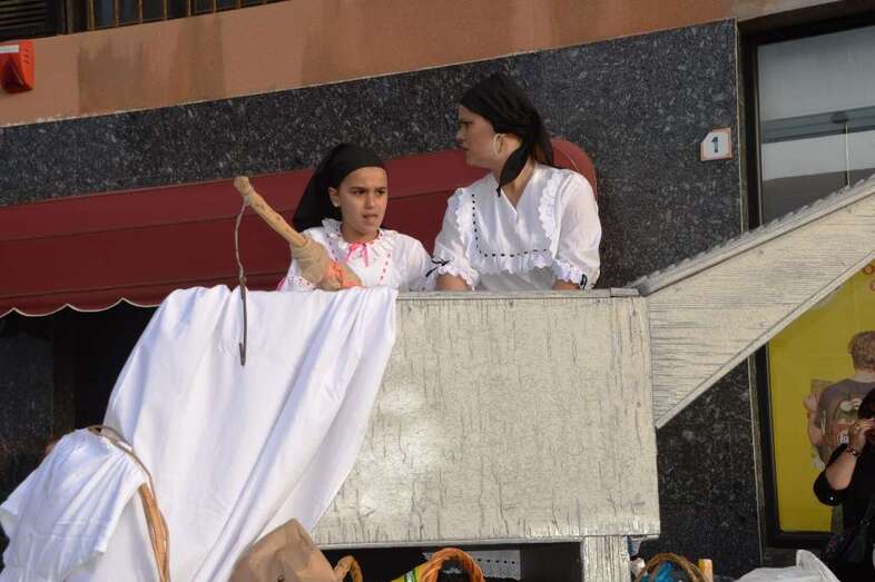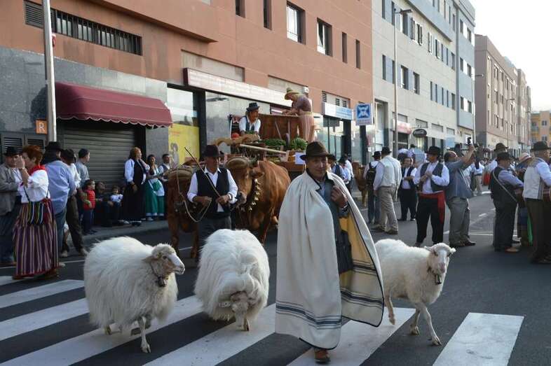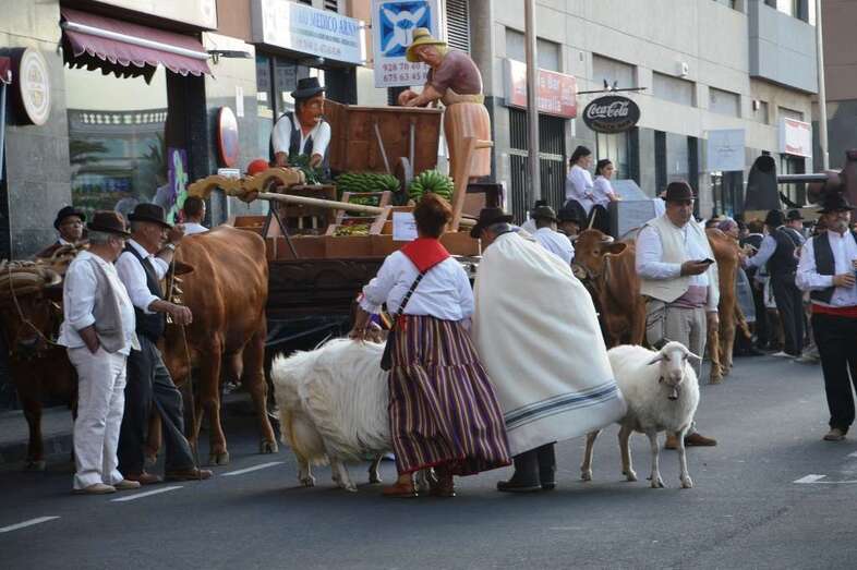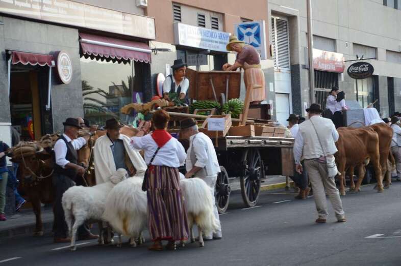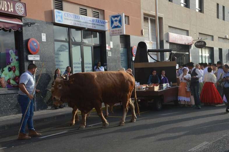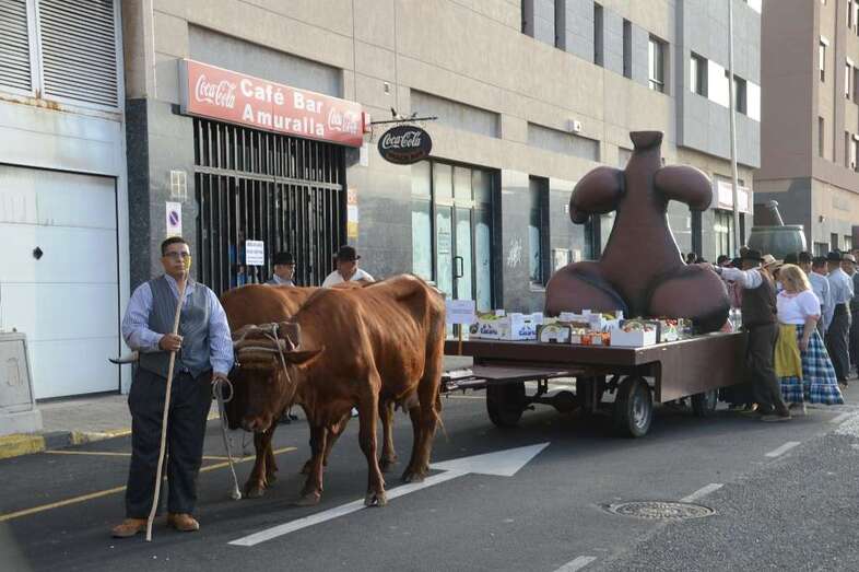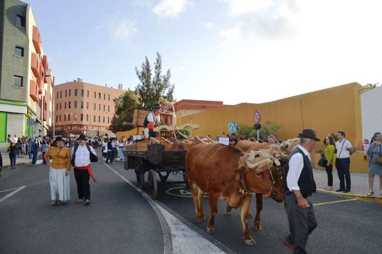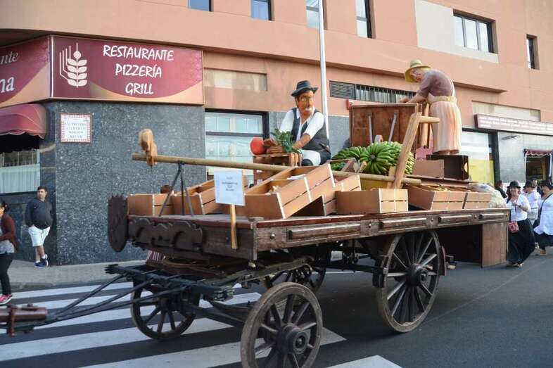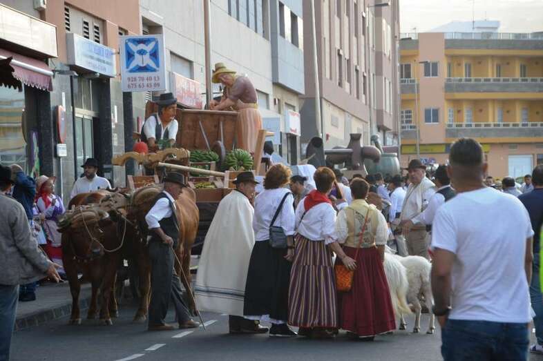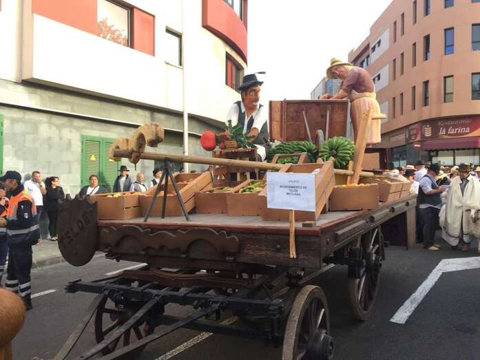 En total son ocho los carromatos que llenan de alegría y costumbrismo el barrio sanjuanero, con una tímida afluencia de público en la parte inicial. En primer lugar la institucional del Ayuntamiento de Telde que desfiló en conjunto con el colectivo Meclasa. Luego las de El Manantial de Lomo Magullo, Valle de los Nueve Alto, Los Goretes de Lourdes de El Goro, El Roque Azucarero, San Pedro de El Ejido La Breña y, por último, la que aglutina a los puesteros del Mercado Municipal.