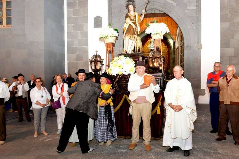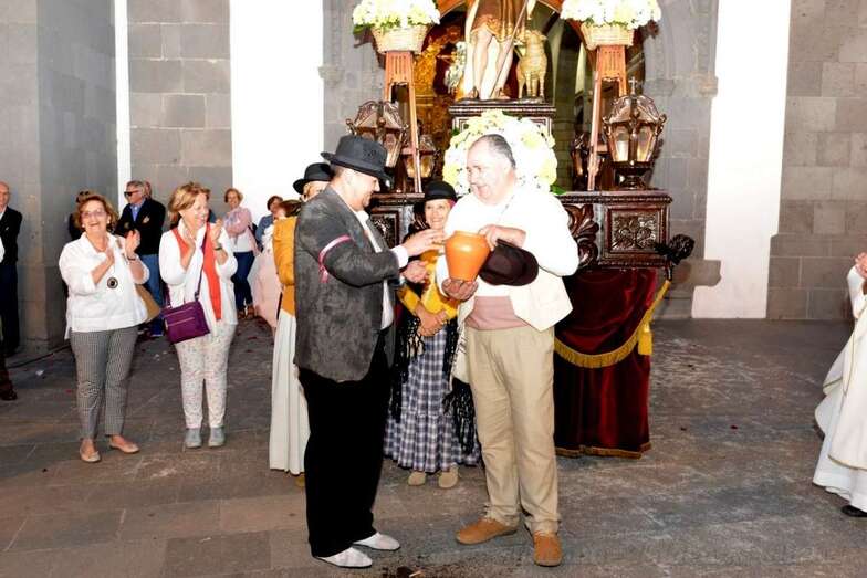 A su llegada a la plaza de San Juan, los romeros de Lomo Magullo entregaron su ofrenda al santo y una talla al Ayuntamiento que recogió el concejal de Festejos Juan Martel.