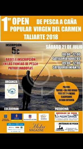 El I Opon de Pesca a Caña Popular Virgen del Carmen Taliarte 2018, organizado por el Club SamaDorada que preside Isidro Sosa y patrocinado por los negocios La Piedra Grande (La Pardilla), La Casa del Pescador y Náutica Taliarte, congregará a adultos y niños entre las 8.00 y 12.00 horas en el muelle de Taliarte. Entre las 12.00 y 12.30 horas será el pesaje de las capturas y media hora después tendrá lugar la entrega de trofeos en la sede del club en la cancha deportiva de Melenara, donde habrá un brindis con paella, según explicó Sosa.