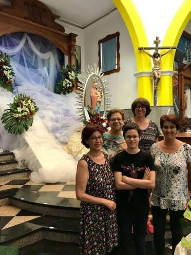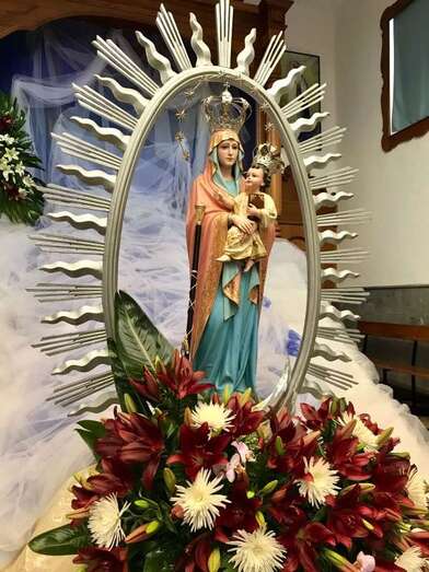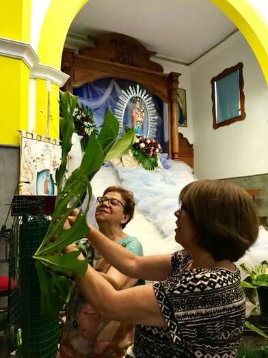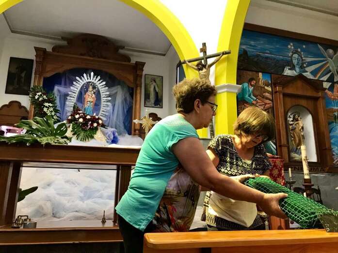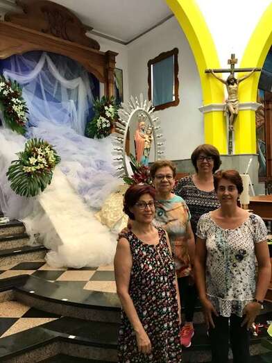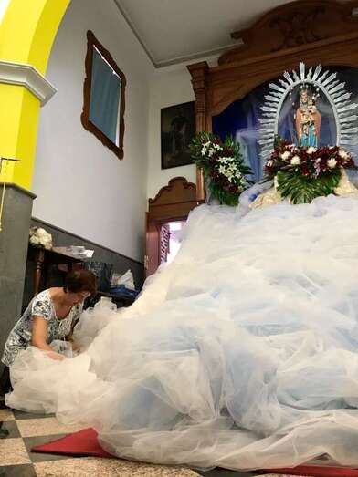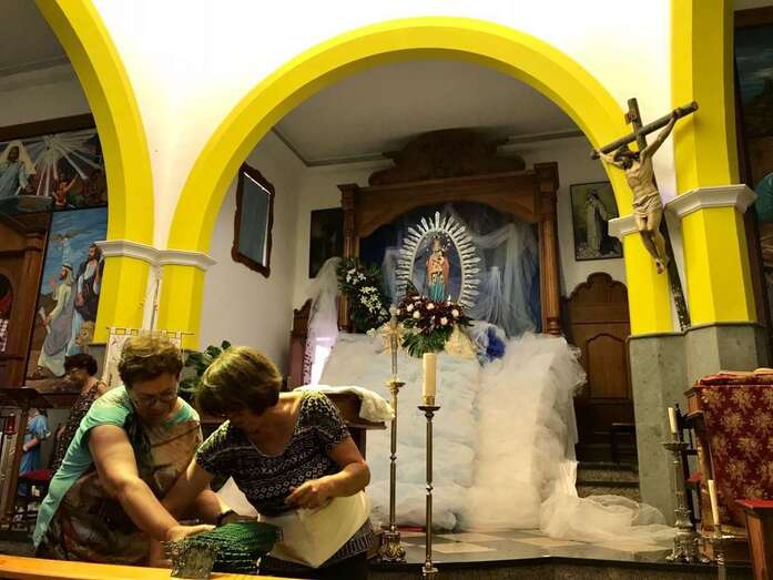 Un grupo de camaristas comandado por las hermanas Mari Carmen y Nieves Sánchez, que vienen desarrollando esta ocasión desde hace más de 30 años, ha trabajado ha destajo en la jornada de este sábado para que todo esté a punto para la celebración. A ellas se han querido sumar vecinas como Carmencita Suárez, pregonera de las fiestas de este año, o Amalia Sánchez.