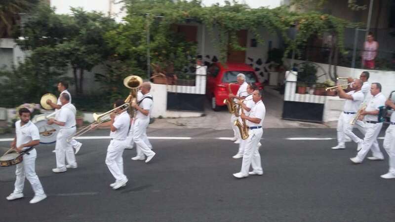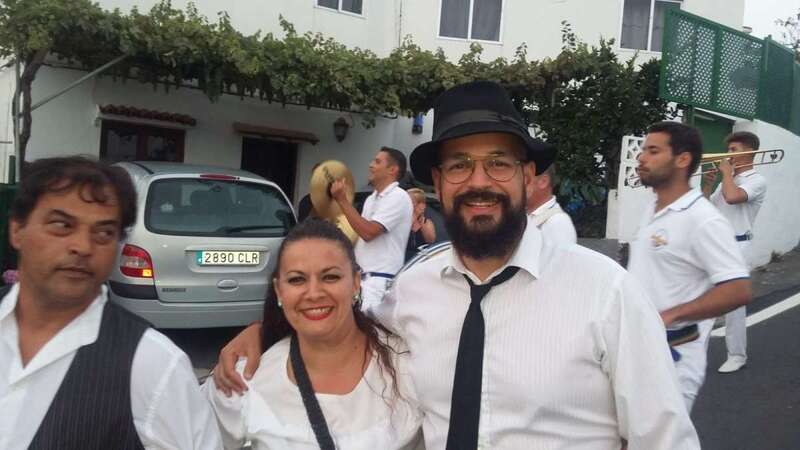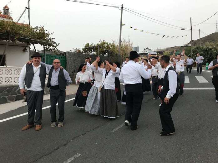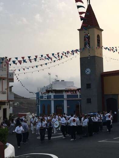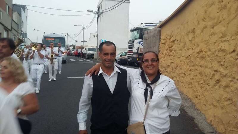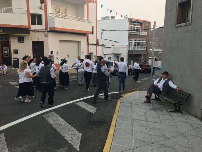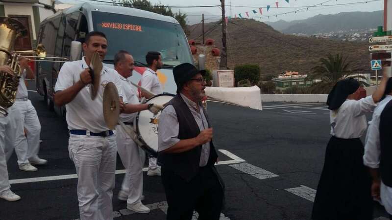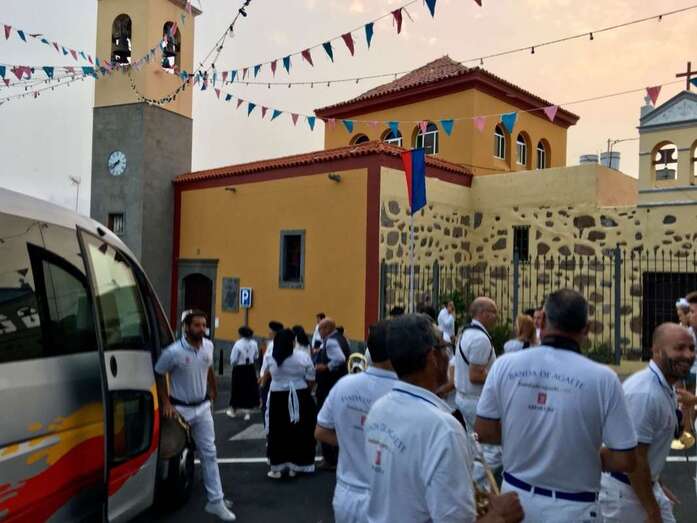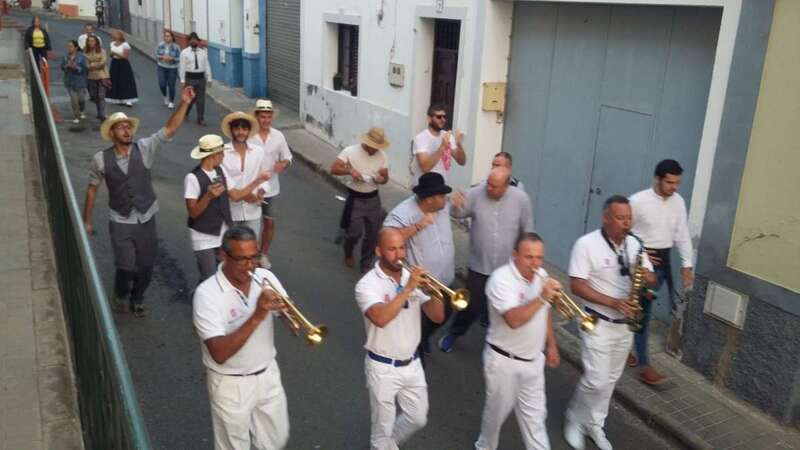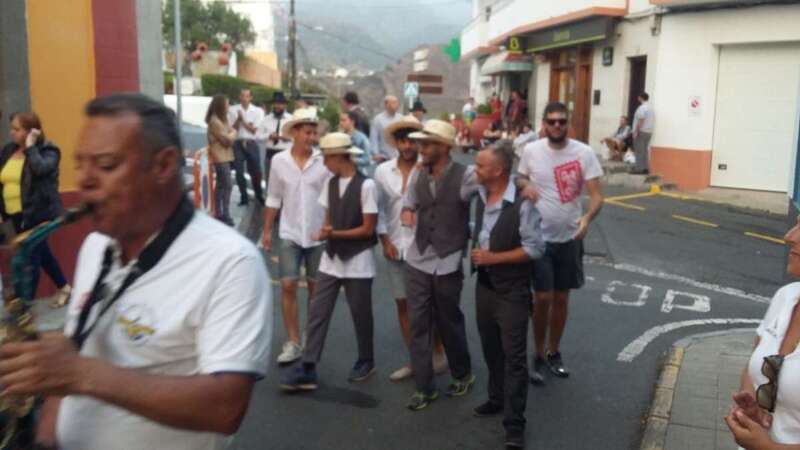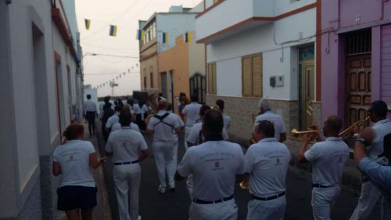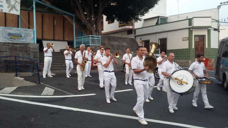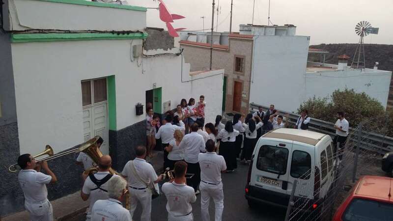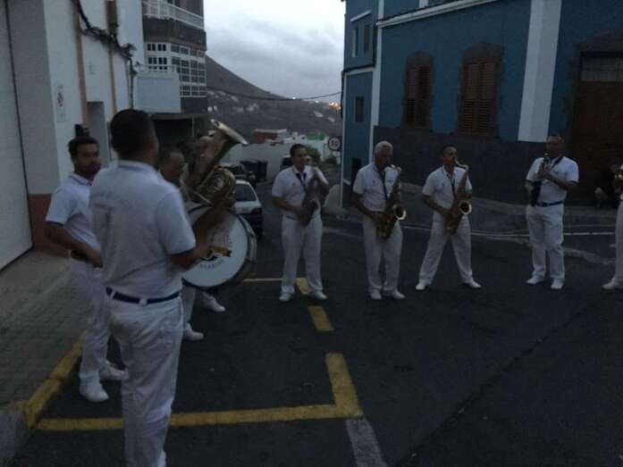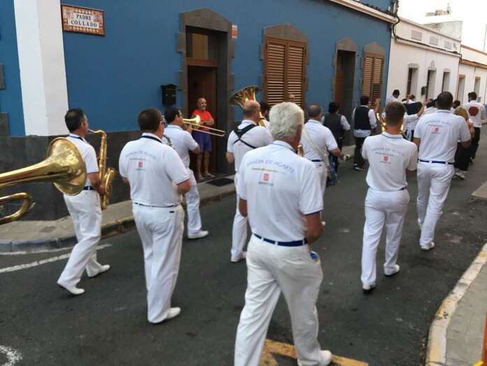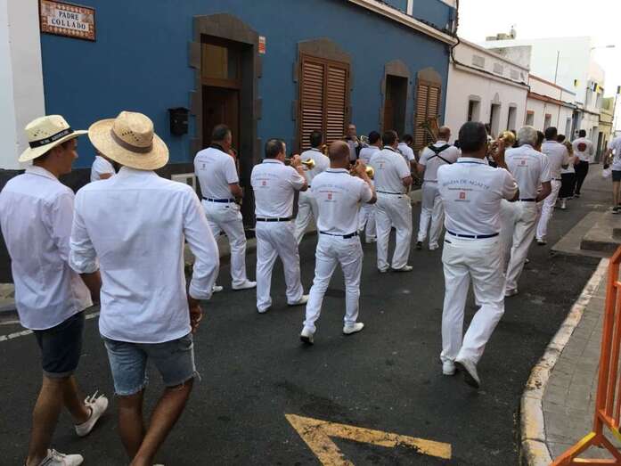 Muchos lugareños saludaron el paso de la banda desde azoteas y ventanas y otros se incorporaron de inmediato a la alegre comitiva vestidos ya con atuendos típicos canarios, preparados ya festejar para la Traída del Agua en un día especial porque esta fiesta celebra sus bodas de oro (50 años).