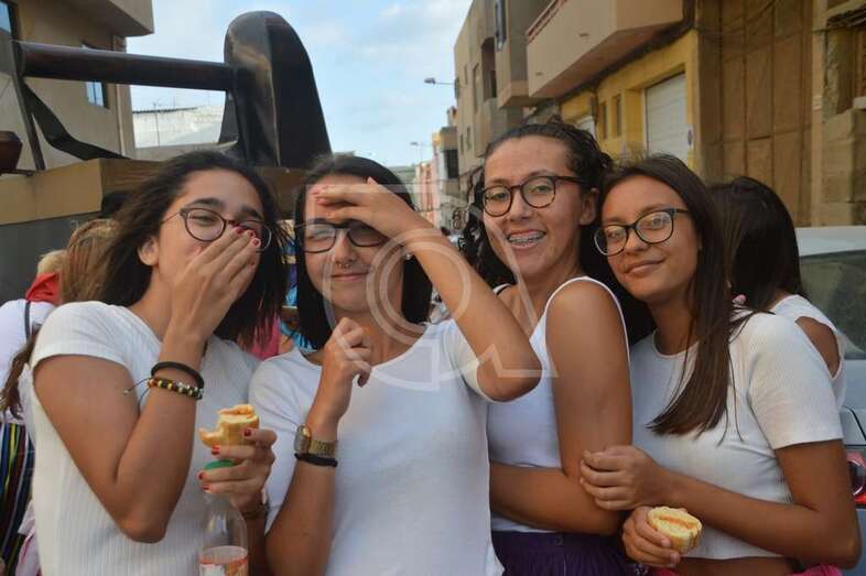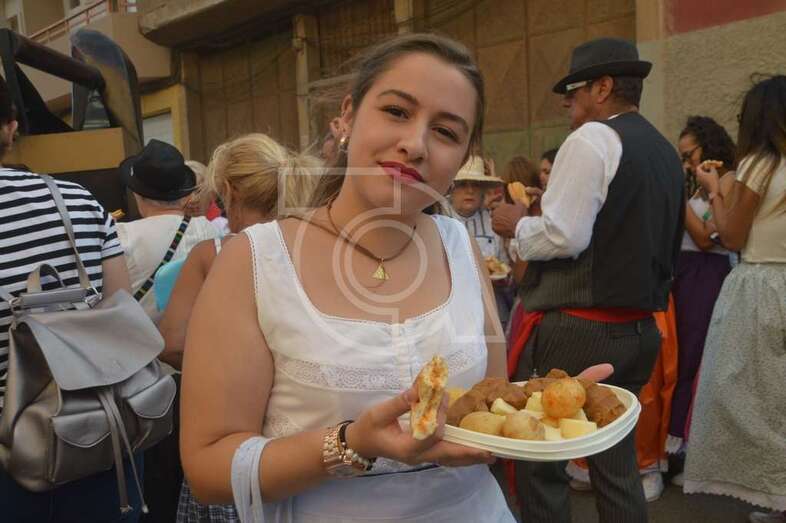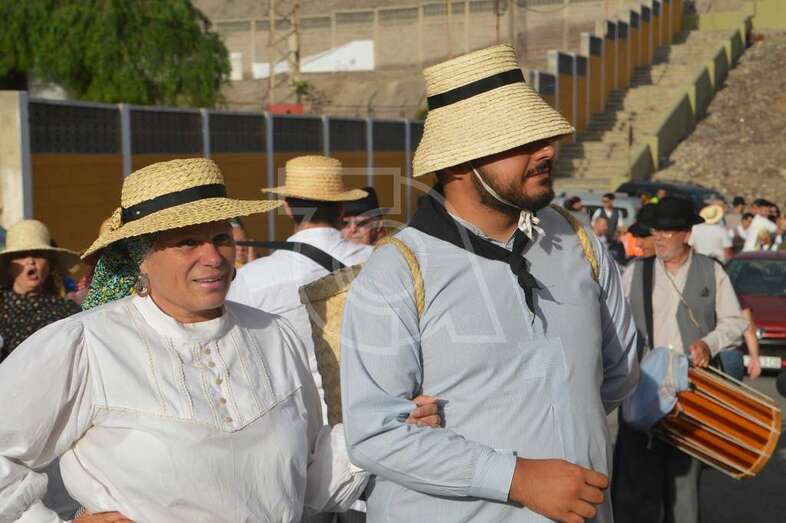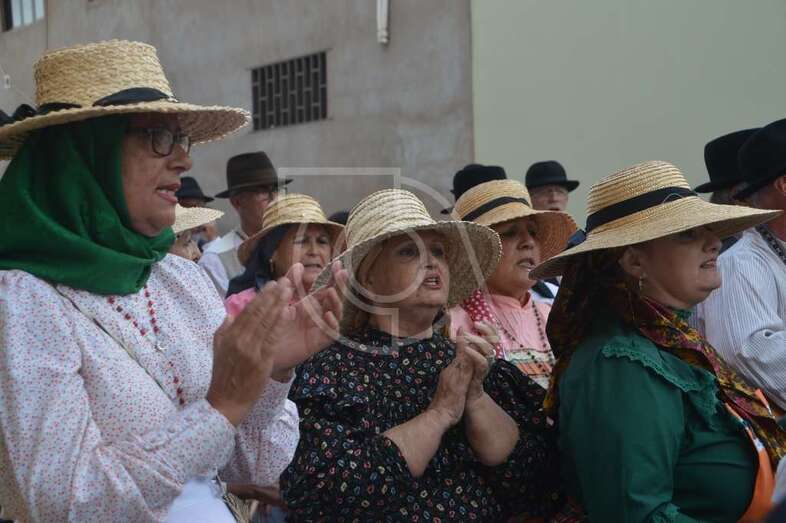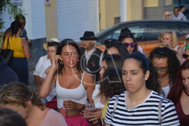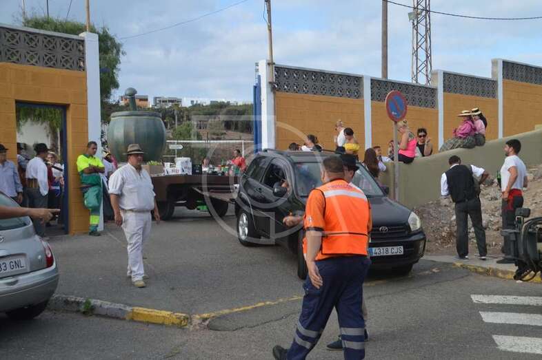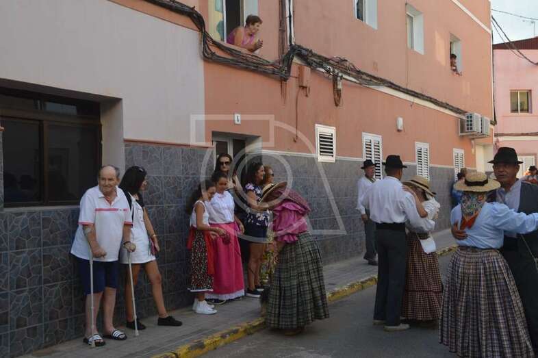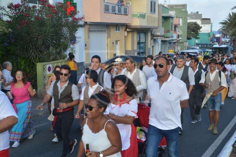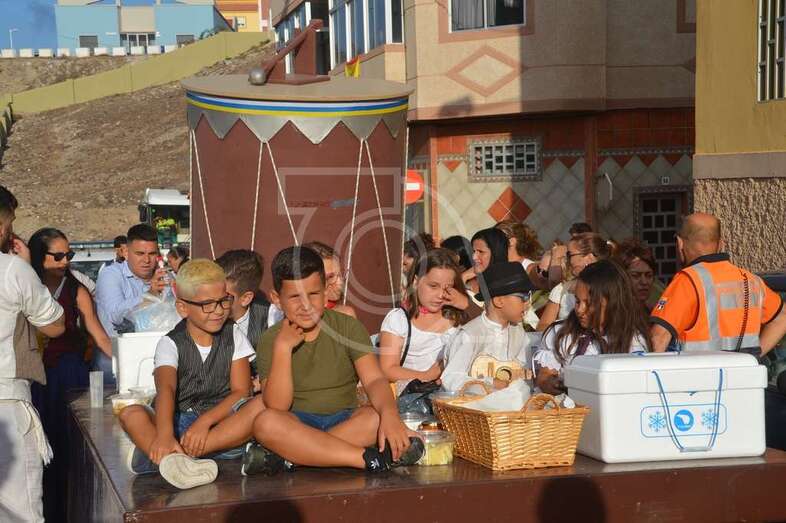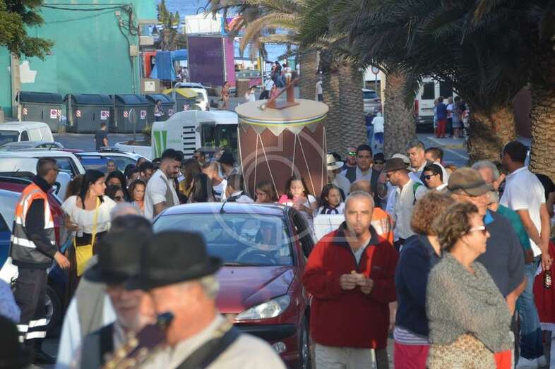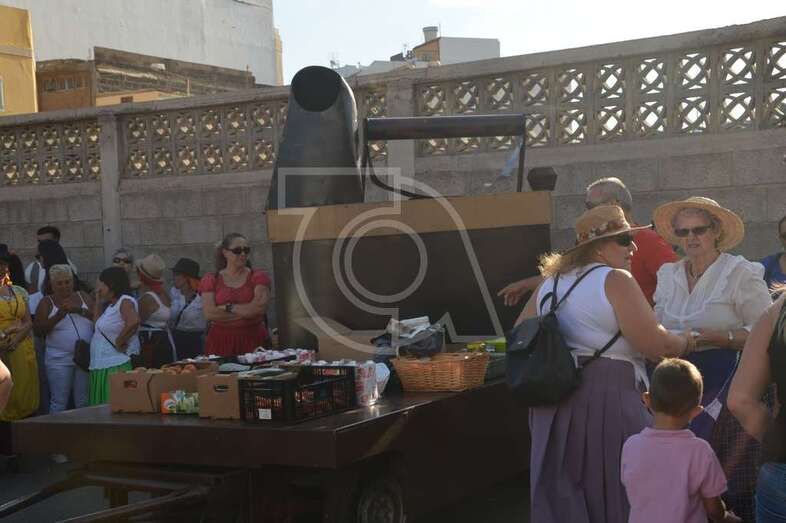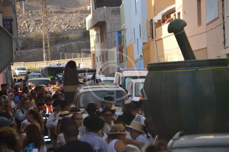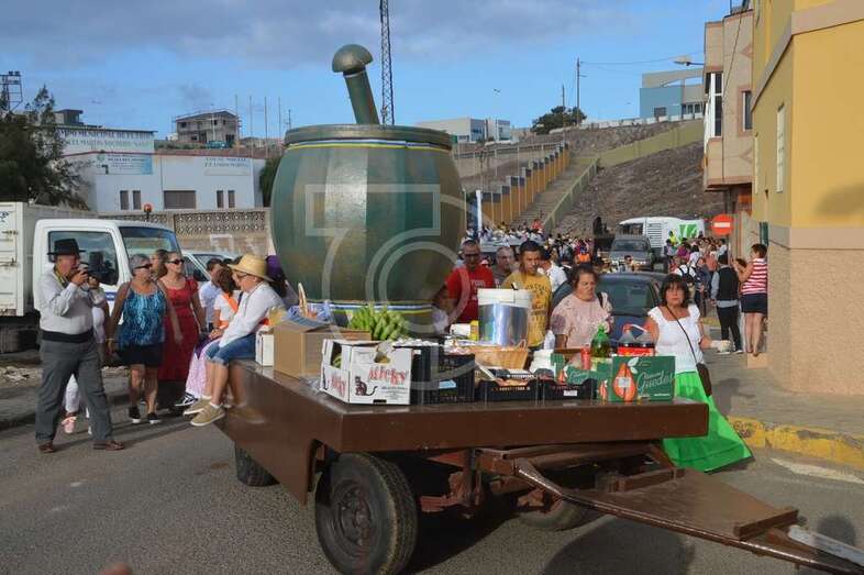 Tres carretas (almirez, máquina de plancha de vapor y el tambor) que portaba las ofrendas y el condumio de huevos duros, tortilla, bocadillos de chorizos, etcétera, que se repartió entre los asistentes y público, dieron vistosidad a este desfile que contó con el acompañamiento musical de la Agrupación Folclórica Tajea y Torna, Maycá, Cuerpo de Baile El Salitre del Faycán y la parrandas de Hoy p’a mañana, grupos que aportaron color y bullicio a la comitiva.