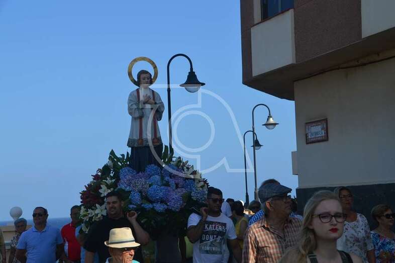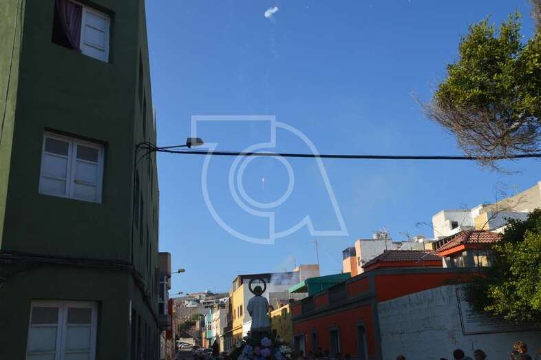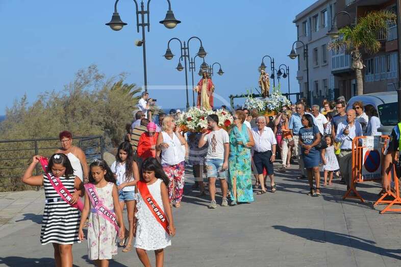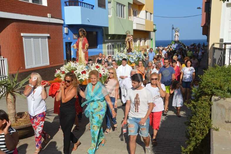 Después de un recorrido por la avenida de Melenara, la procesión enfilo el sector viejo de esta playa donde fue saludada por varias descargas de voladores y los vivas del público. Poco a poco, las imágenes se fueron acercando hasta la arena de la playa, en donde les esperaban las tres embarcaciones de pescadores que las pasearían por el litoral de Melenara, Taliarte, Claveillas y Salinetas.