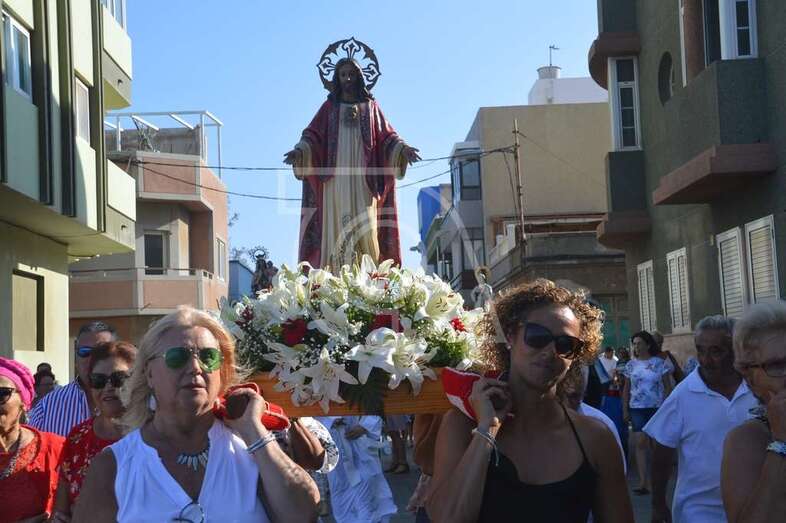 La comitiva religiosa, acompañada por numerosos fieles, efectuó el trayecto habitual por la arena y calles de esta playa, donde la Virgen del Carmen, el Corazón de Jesús y el Santo Cura de Ars fueron acogidos con aplausos, vivas, despliegue de banderas españolas y una atronadora exhibición de fuegos artificiales a la altura de La Barranquera, en su vuelta al templo de Clavellinas.