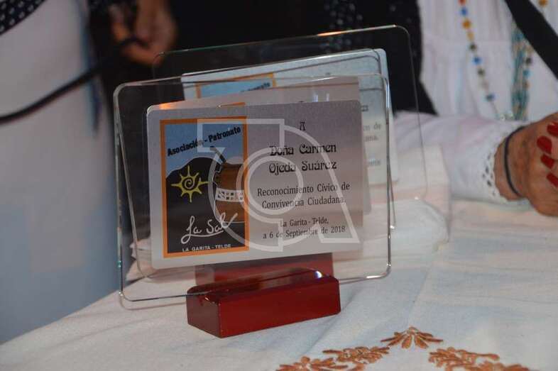 El homenaje fue acto sencillo, alejado de boatos y protocolos. El marco, la plaza pública, y las protagonistas, Toñi Morales Egea (asistió su hija en su nombre), Carmen Ojeda Suárez, Emérita Robaina Padrón y Sara Hatchuell, recibieron el cariño de sus convecinos en un acto organizado por el Patronato La Sal en el marco de las fiestas populares en honor del Sagrado Corazón de Jesús.
