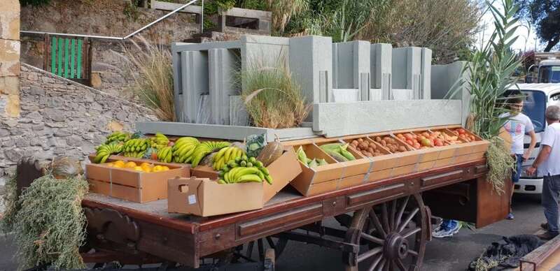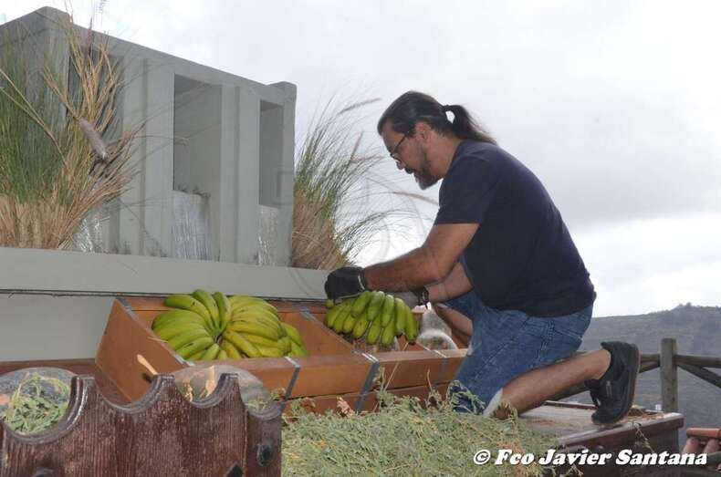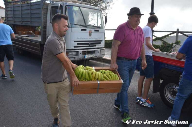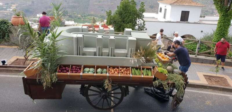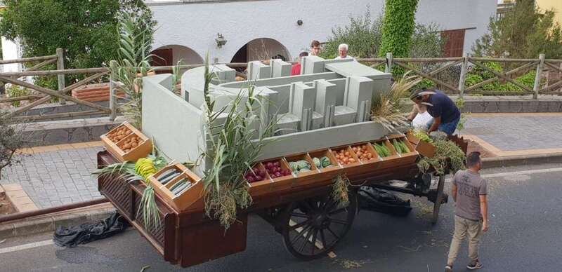 Tirada por una yunta de bueyes, la carreta, que este año en realidad no era una estructura tradicional sino una plataforma, transportó más de 300 kilos de productos de la tierra, entre los que destacaban el gofio y una gran variedad de frutas y verduras, que luego se entregaron como ofrenda a la Virgen.