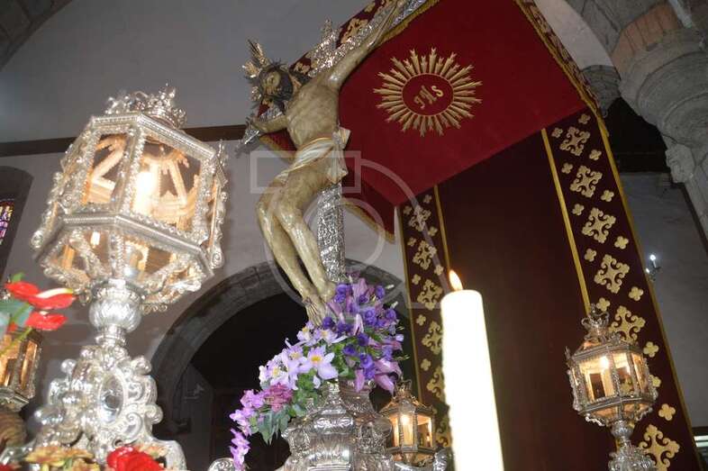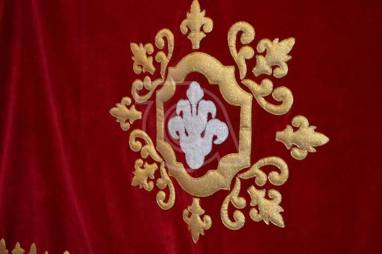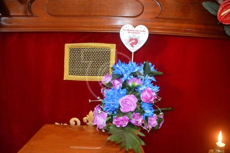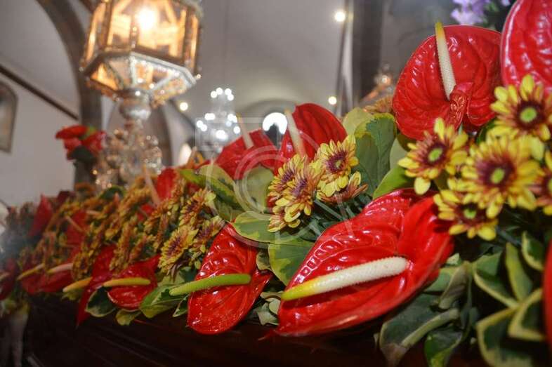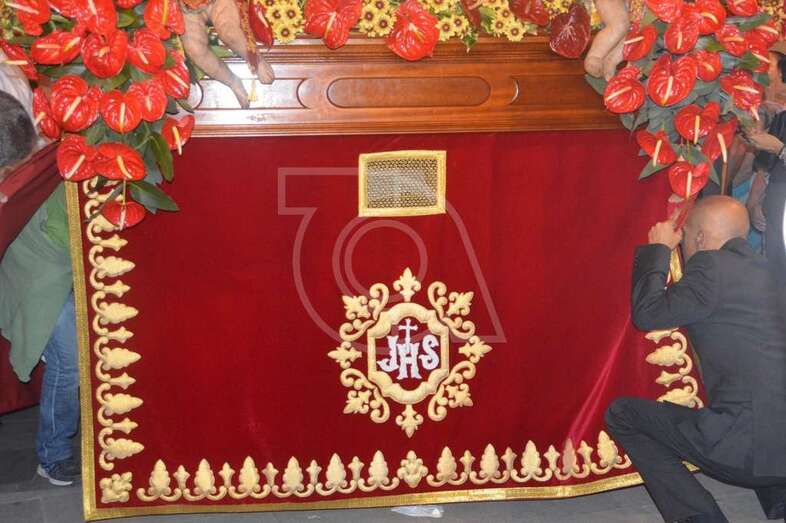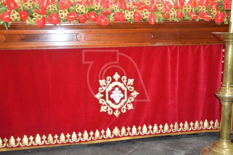 El trono, que lucía para la ocasión un discreto y bello arreglo floral hecho por Segundo Amador en el que resaltaba sobremanera las 250 varas de anturios rojos, mostraba los nuevos cuatro faldones color burdeos y con cenefa en oro diseñados en los últimos tres años por este colaborador de la Parroquia de San Juan, a la que ha dedicado más de 40 años de su vida.