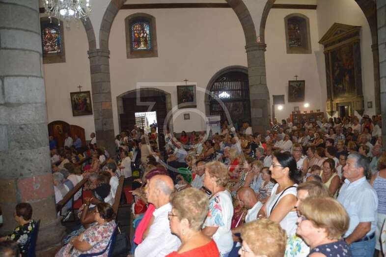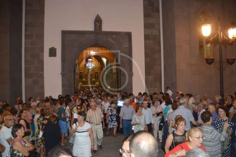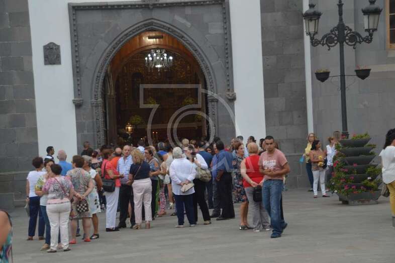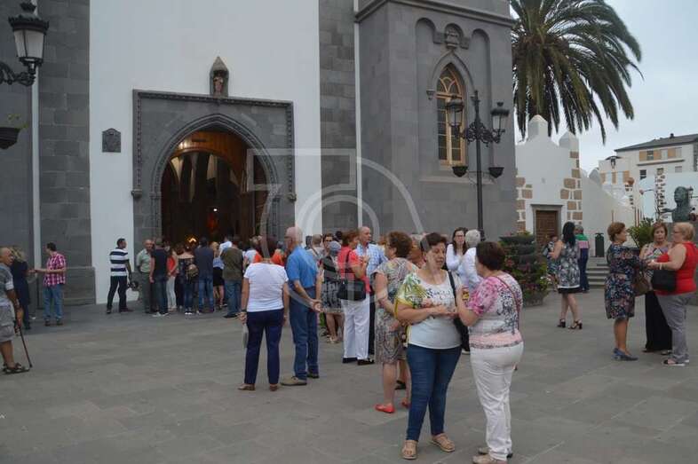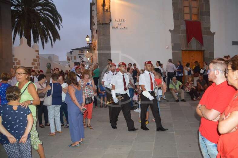 La Agrupación Musical La Salle de Agüimes abría el multitudinariodesfile -se notó una mayor afluencia de fieles acaso debido al hecho ser festiva esta jornada en Telde- que se inició al filo de las 20.20 horas cuando el trono de la imagen asomaba por la fachada principal de la Basílica de San Juan, tras la solemne eucaristía que presidida por el obispo de la Diócesis Canariensis, Francisco Cases Andreu, en presencia de numerosos párrocos del Arciprestazgo de Telde, comenzaba a las 19.00 horas.