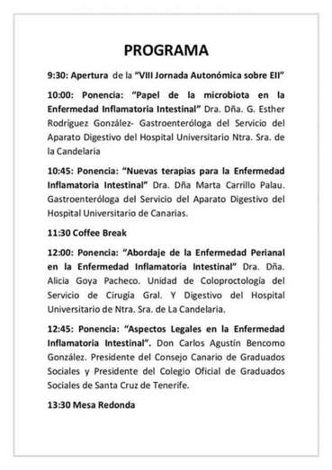 Tras la presentación del encuentro, a cargo de Jesús Delgado, gerente del Hospital de La Candelaria; María Dolores Alonso, directora de Recursos Humanos y Defensa Jurídica del Cabildo de Tenerife; y Fuensanta Amador, presidenta de ACCU Canarias, se desarrollaron varias charlas en torno a esta patología digestiva que se manifiesta con síntomas intestinales como dolor, diarrea (con o sin moco y sangre), estreñimiento, cansancio, fiebre, vientre hinchado y otras sintomatologías.