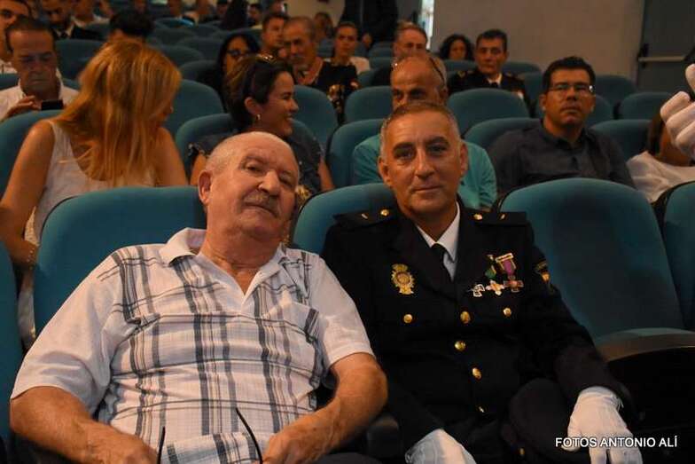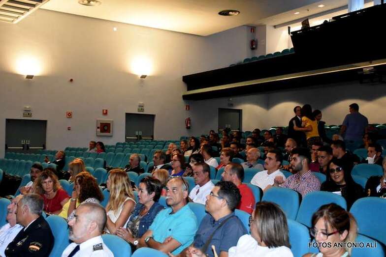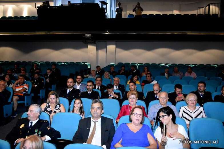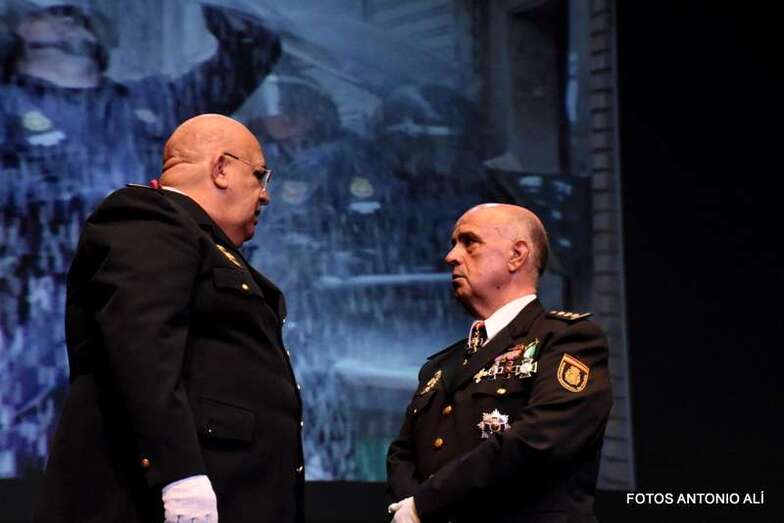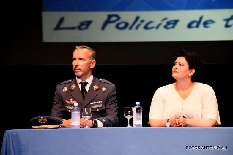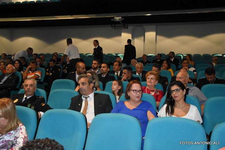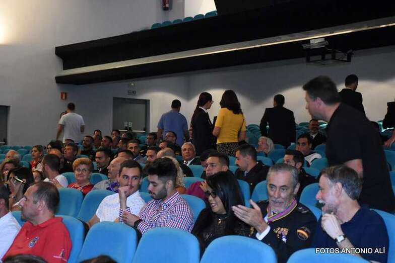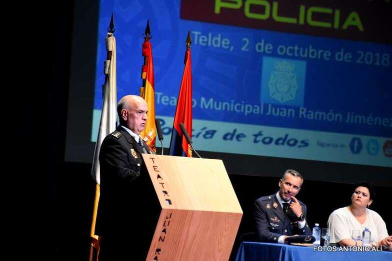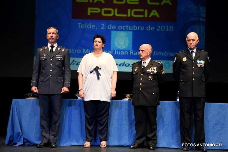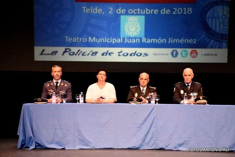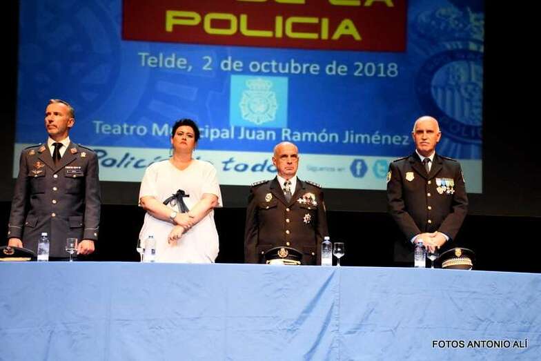 Fue la ceremonia en el Teatro Juan Ramón Jiménez el acto central y el que mayor atención acaparó, con la entrega de una serie de distinciones. Una celebración que arrancó con todos los presentes en pie mientras sonaban los acordes del himno de España y con una mesa de honor presidida por el comisario del CNP en Telde, Jesús García Ayer, el jefe de la Policía Local, el subinspector Felix Ramos, la vicealcaldesa Celeste López y el teniente coronel del Ejército del Aire Raúl Ávila Gómez, precisamente quienes condecoraron a los homenajeados.