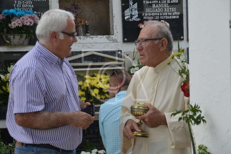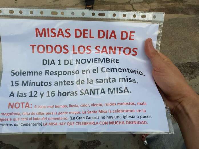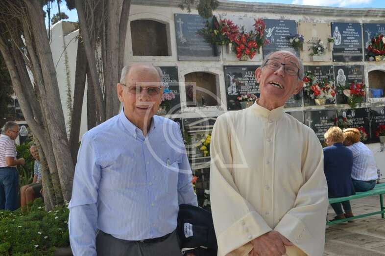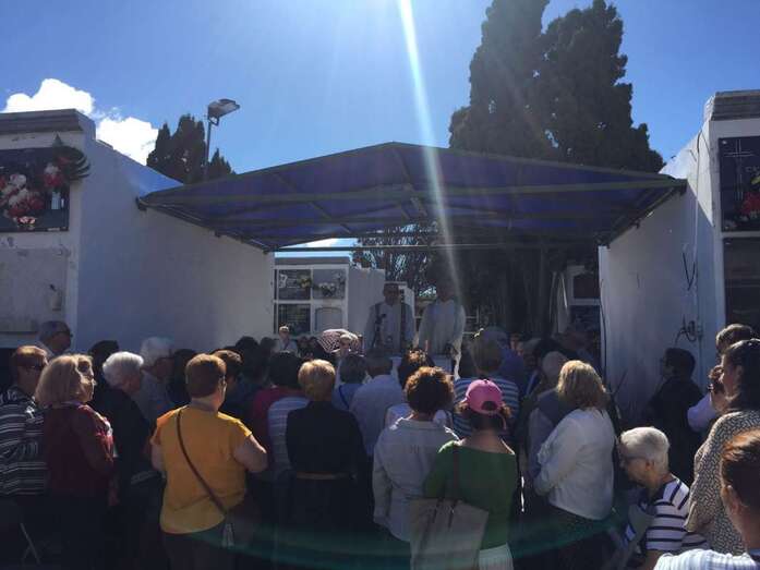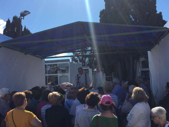 En el de San Juan a las 11.00 horas, los sacerdotes José María Cabrera y Eugenio Peñate oficiaron una misa bajo un toldo que fue seguida por decenas de personas que se encontraban en esos momentos en el camposanto.
