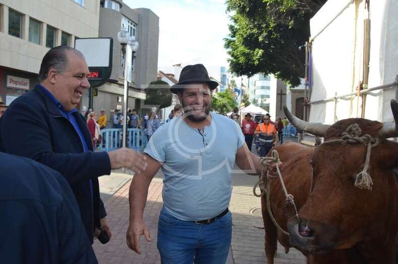Mientras, en las ramblas Pedro Lezcano Montalvo, se desarrolla la también radicional feria de ganado desde las 9.00 y hasta las 13.00 horas, momento en que los animales estaba previsto que desfilaran delante del templo y la imagen del santo patrono, pero finalmente se desistió por la amenaza de lluvia y la gran aglomeración de público en el entorno de la plaza.