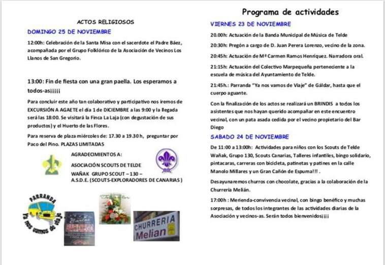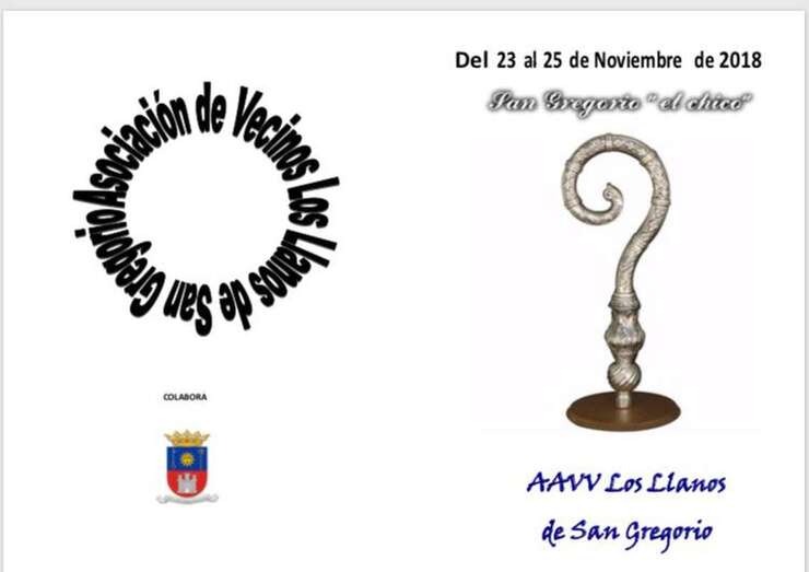 Bajo la organización del colectivo vecinal Los Llanos de San Gregorio que preside la abogada Lidia Mejías, las fiestas comenzarán el viernes 23 de noviembre con la actuación de la Banda Municipal de Música (20.00 horas) y el pregón de Juan Perera Lorenzo, vecino del lugar, media hora después.