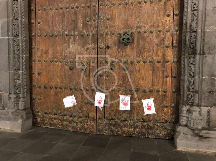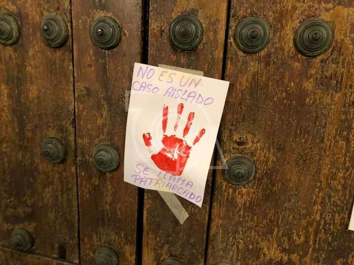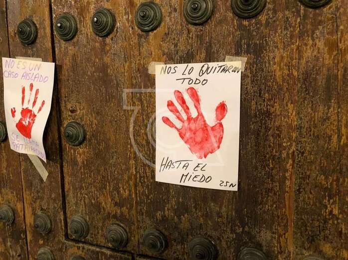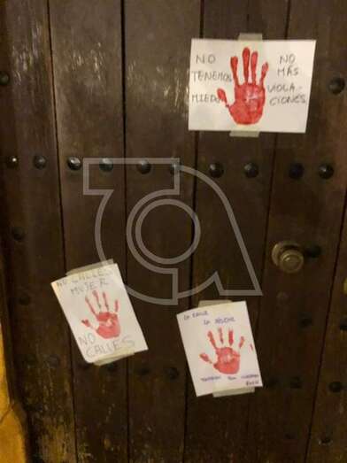En el portalón de madera del templo matriz de San Juan se fijaron cuatro carteles que contenía mensajes como No los quitaron todo…hasta el miedo o No es un caso aislado, se llama patriarcado.