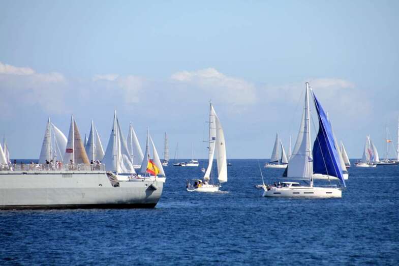 Aún permanece el BAM, Meteoro, de la Armada Española, observando cómo se desplazan en el arranque a toda vela aprovechando la brisa y metiendo caña para aprovechar el alisio bajo reinante. A lo largo del litoral tomando posiciones desplegando sus velas, se desdibujan los perfiles al entrar en zonas distantes de los puntos en que nos encontramos; una línea blanca de horizonte límite entre el mar y cielo, rota por algún velamen de color, desde la bahía de nuestro puerto han prestado motivos coloristas, muy marineros, en el contraste de las frágiles embarcaciones con la de los gigantes de acero atracados en el Muelle Reina Sofía.