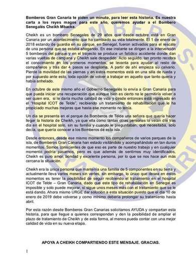 Un día se presenta en el parque de bomberos de Telde una señora que quería hacer llegar la historia de Cheikh, ya que ella como tantas otras personas lo veían día tras día en el hospital solo, sin su familia y cuando le preguntaban, qué necesitaba, solo decía, que quería conocer a los bomberos de esta isla.