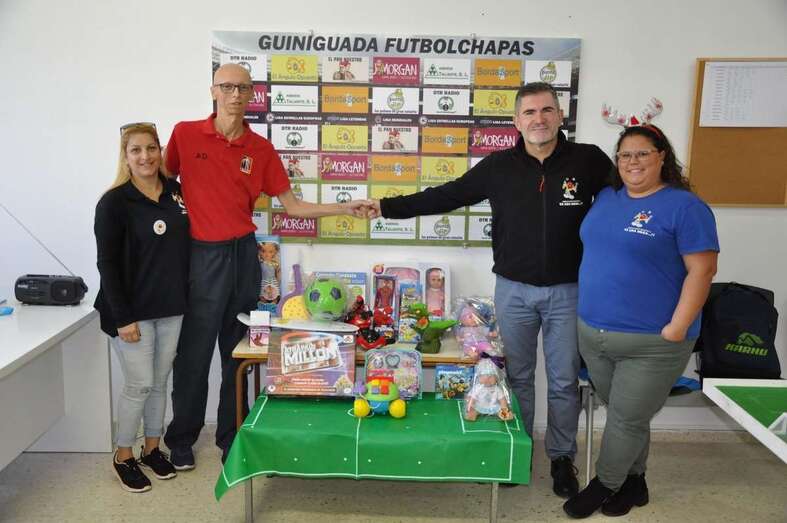 Telde.- Está visto que los Reyes Magos también juegan al fútbolchapas. Melchor, Gaspar y Baltasar se dejaron ver ayer, aunque sea de forma simbólica, por la sede del Club Guiniguada, en Jinámar, para regalar un buen puñado de juguetes a los niños a los que atiende la ONG Ya era hora, dedicada a acompañar y entretener a los chiquillos y jóvenes enfermos de cáncer o de diabetes del Materno Infantil.