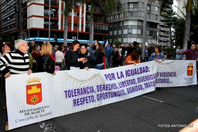 Una amplia representación de colectivos feministas, grupos políticos y movimiento asociativo de Telde participó en la protesta callejera en la que los manifestantes, en su mayoría de mujeres, marchaban tras grandes pancartas con el lema "Si las mujeres paramos, se para el mundo", y llevaban otras con reivindicaciones como "Igualdad", "Somos imparables", "No es no, lo demás es violación","Llueven mujeres desafiando el poder"o "Ni locas ni santas".