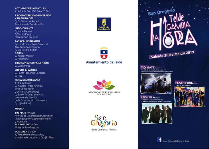 Telde.- La madrugada del próximo sábado al domingo se adelantan sesenta minutos las manecillas del reloj. Y como es habitual, Telde dará la bienvenida al horario de verano con mucha marcha, compras y diversión; con un evento al aire libre que se desarrollará en las calles de la Zona Comercial Abierta (ZCA) de San Gregorio y que tendrá como gran atractivo al grupo Los Lolas.
