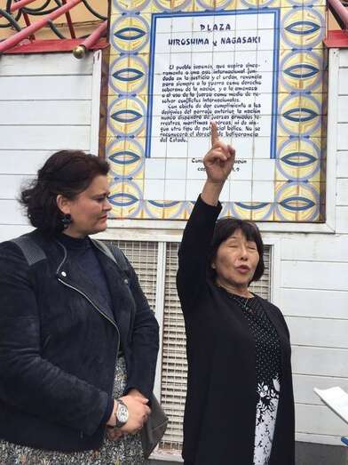 La concejala de Turismo, Celeste López, visitó el viernes la plaza Hiroshima y Nagasaki –situada junto al IES José Arencibia Gil- con una de las supervivientes de los ataques nucleares en agosto de 1945 durante la Segunda Guerra Mundial, Sumie Nakamura, y Masahiko Hisae y Auki Matsui, el periodista y fotógrafo, respectivamente, de la publicación nipona, que están recorriendo el mundo para recoger en un reportaje los lugares y monumentos que recuerdan el compromiso de Japón con la paz.