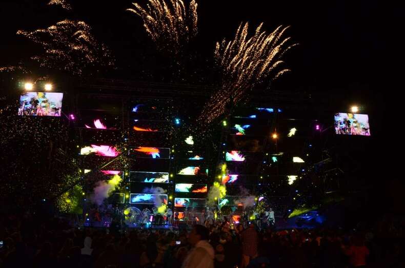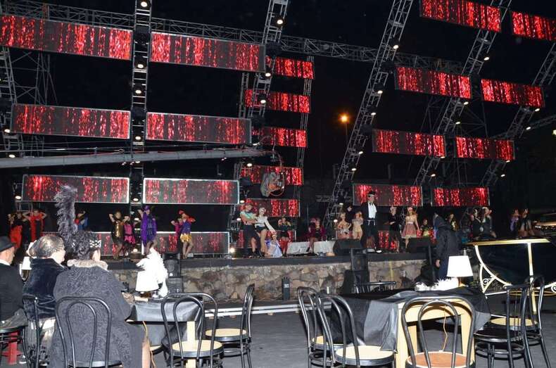 La gala, de dos horas y media de duración, arrancó con una magnífica obertura en la que tomaron parte unos 200 figurantes, entre artistas, bailarines y acróbatas, y que contó con José Carlos Campos (actor del elenco del musical Cabaret) como maestro de una ceremonia en la que por haber hubo hasta un baño en una piscina circular.