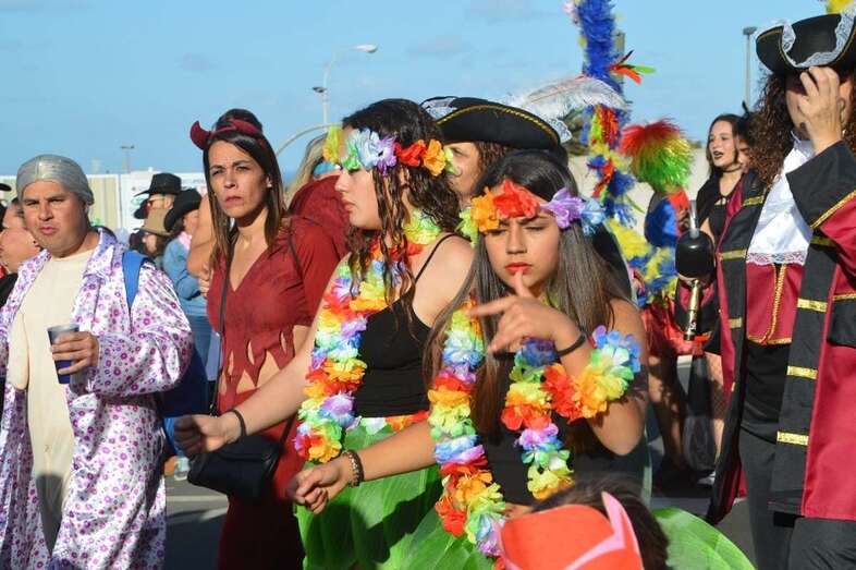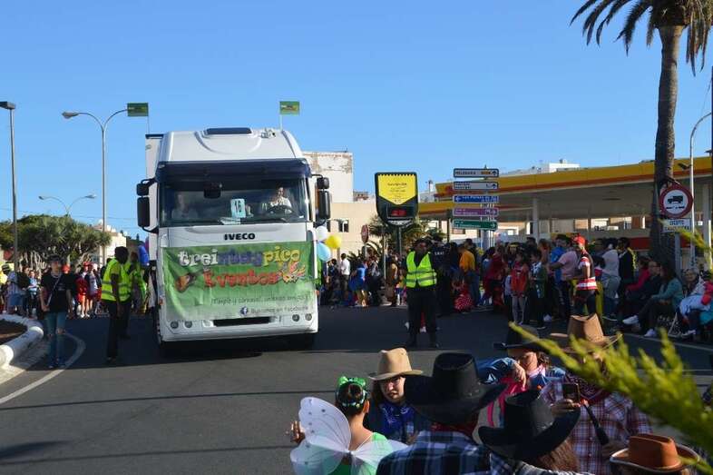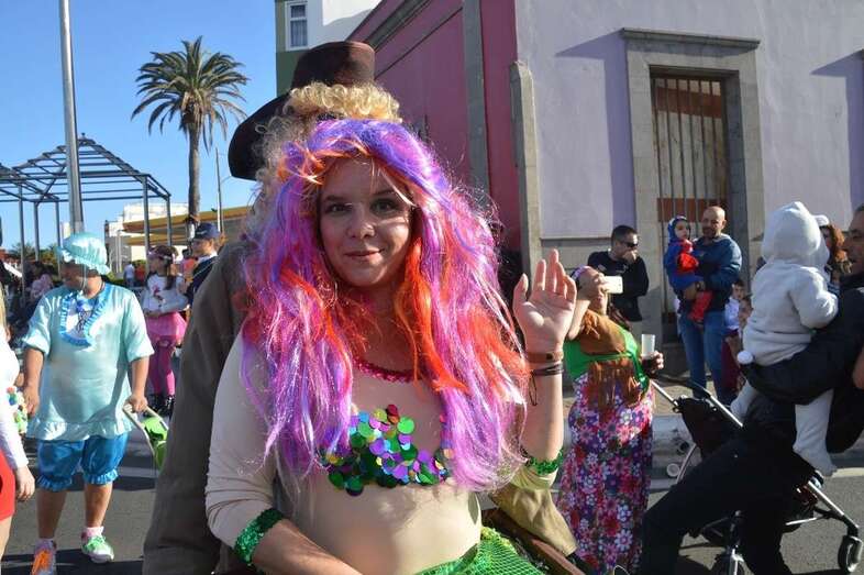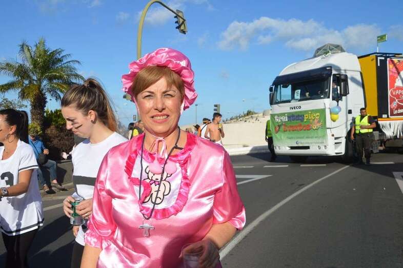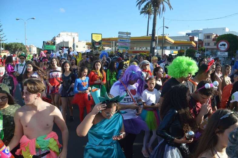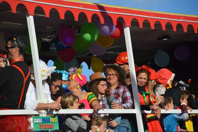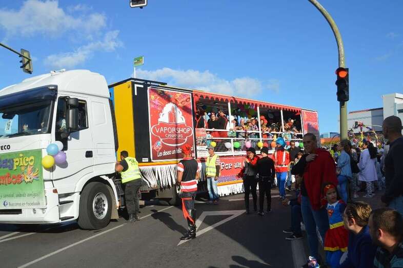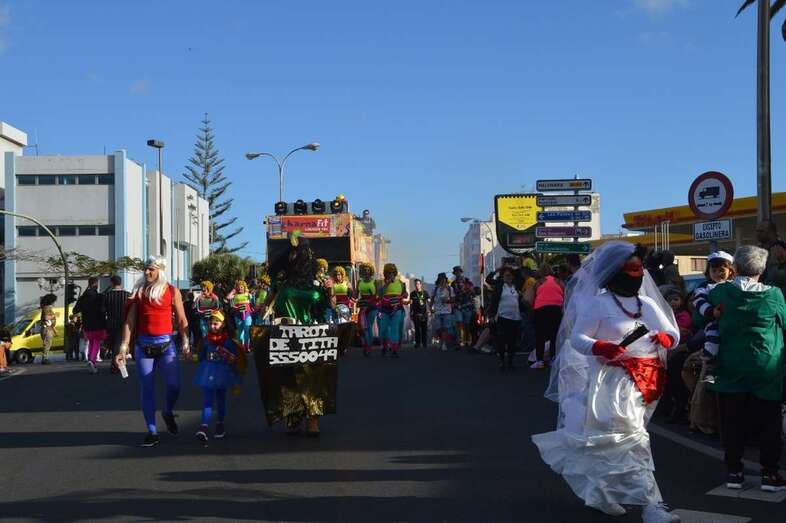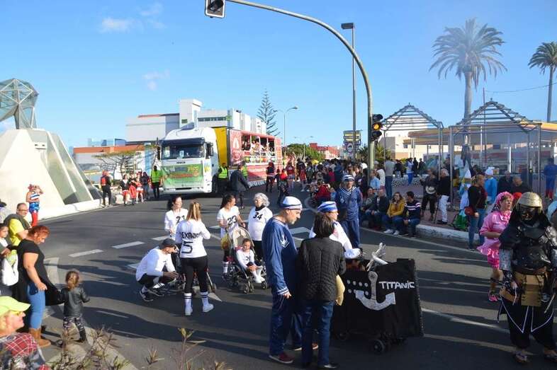 La marabunta carnavalera se puso en marcha pasadas las 17.30 horas en el sector de las ramblas de Picachos y sobre las 20.00 horas su cabeza enfilaba la calle de Alcalde Manuel Álvarez Peña, que desemboca en el entorno del Parque Urbano de San Juan, donde terminaría el ágil desfile de carrozas -una treintena-, grupos (murgas, batucadas, comparsas, etcétera) y miles de mascaritas ataviadas, unas con mucho gusto y otras a su estilo. Un gentió se agolpó en aceras y en la rambla de Arnao para seguir el paso de la cabalgata.