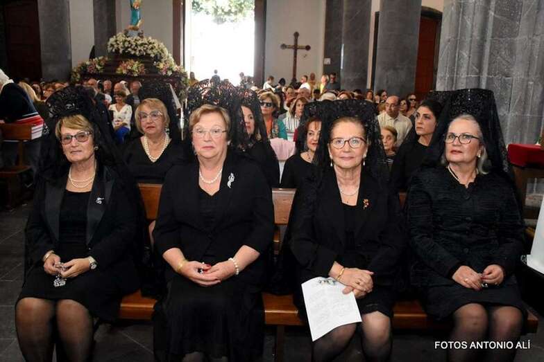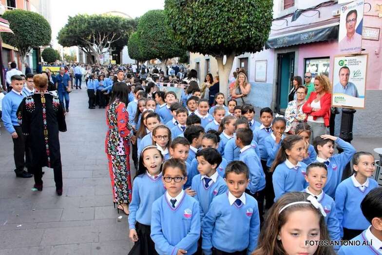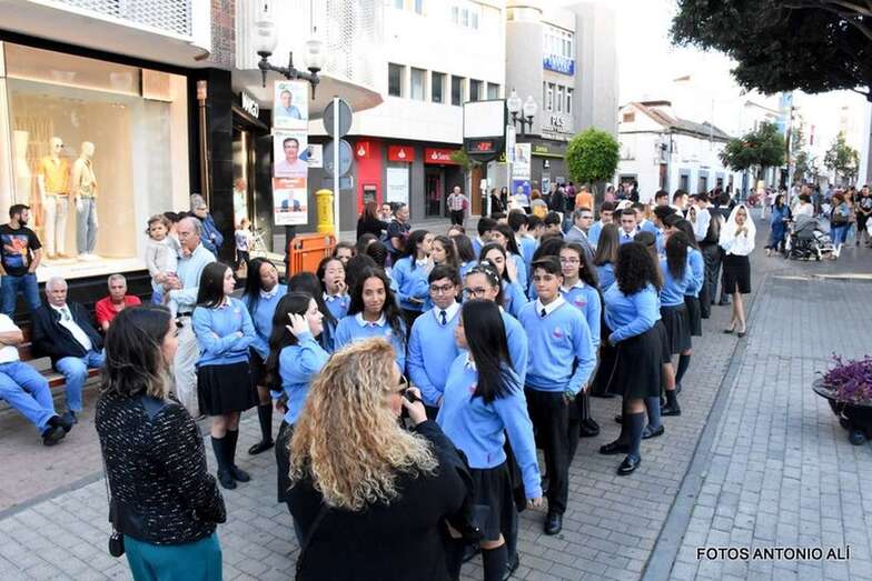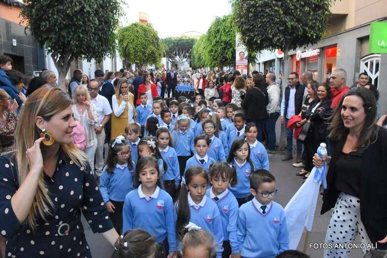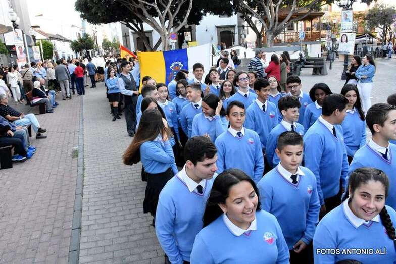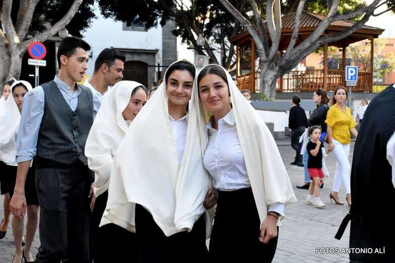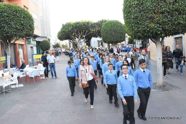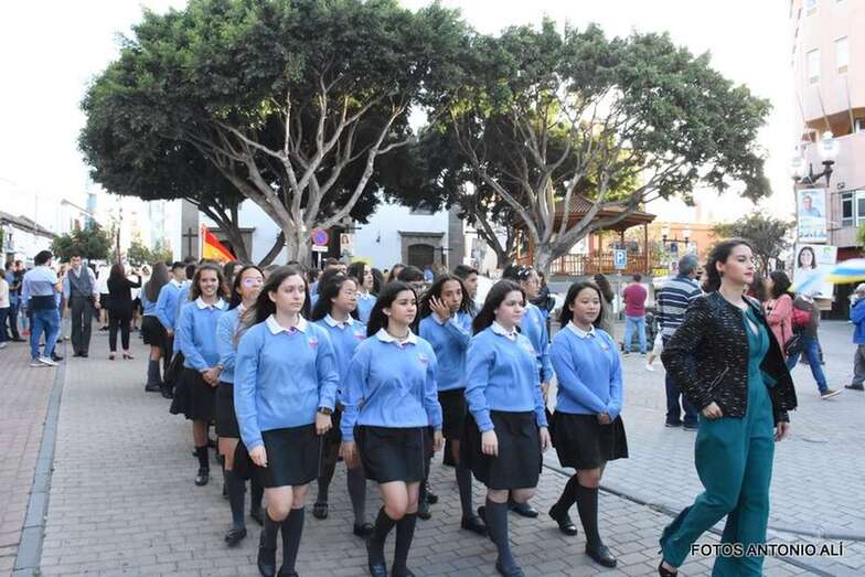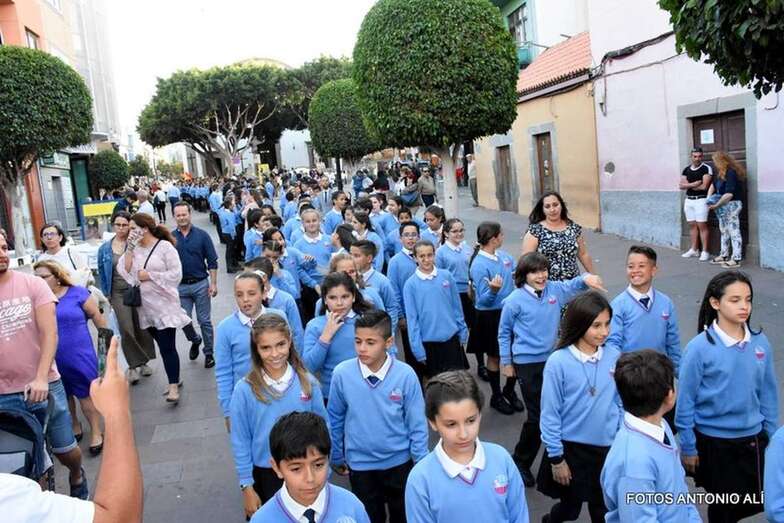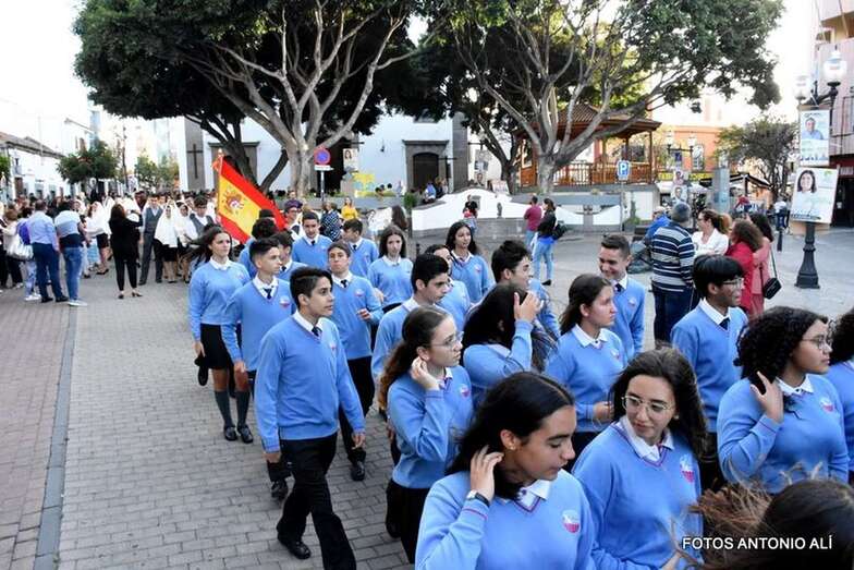 Muchos feligreses, autoridades y la Banda Municipal de Telde acompañaron el cortejo que abría un grupo de alumnos de ambos sexos y de antiguas alumnas ataviadas con mantilla española.