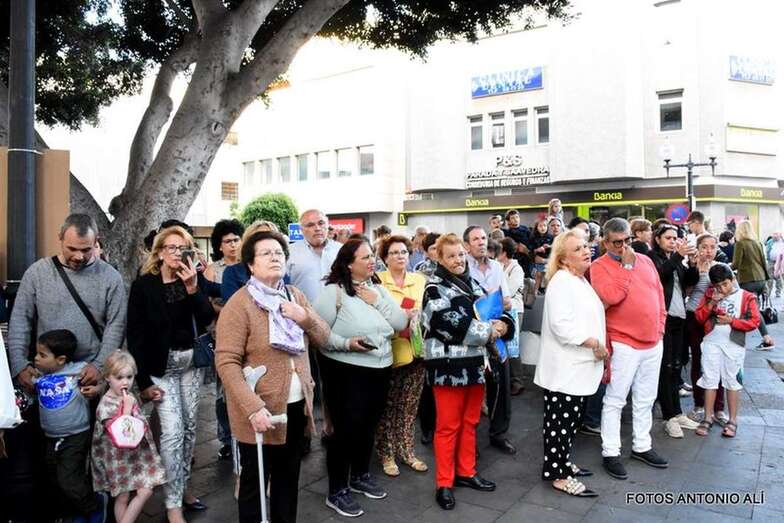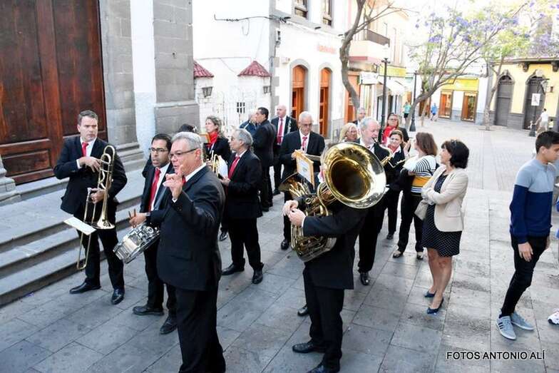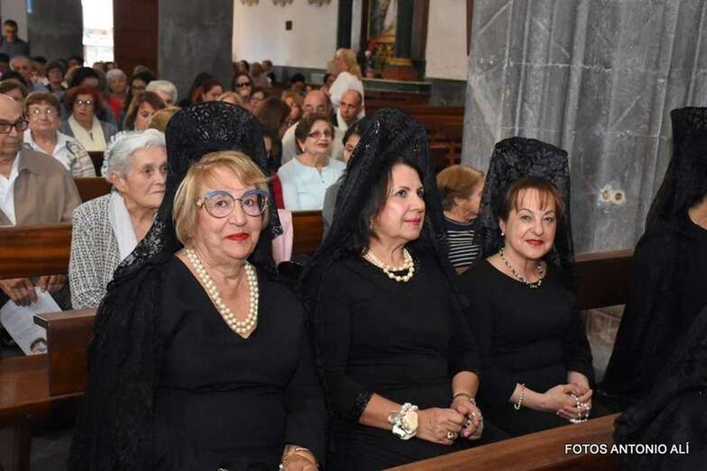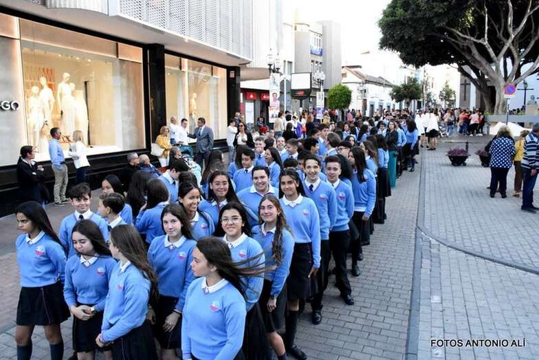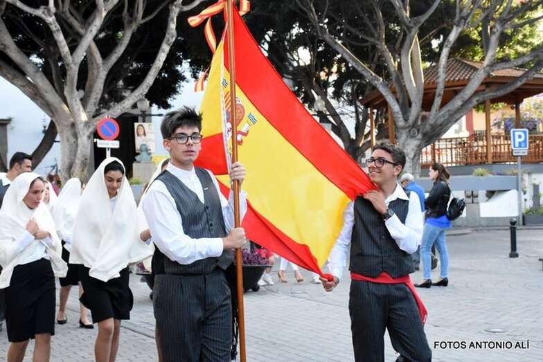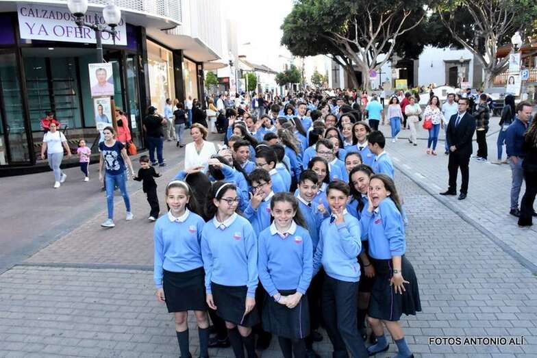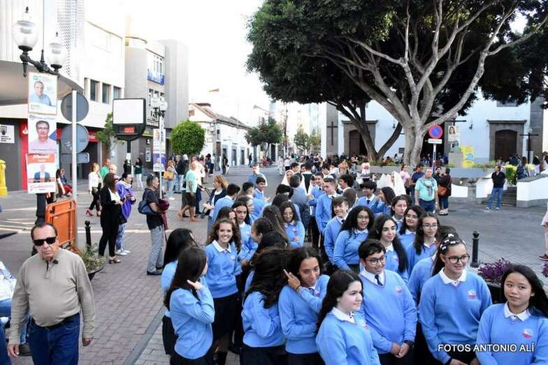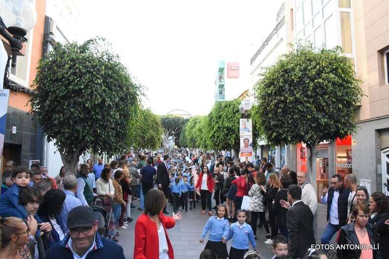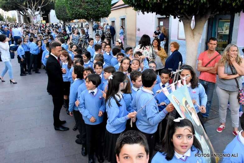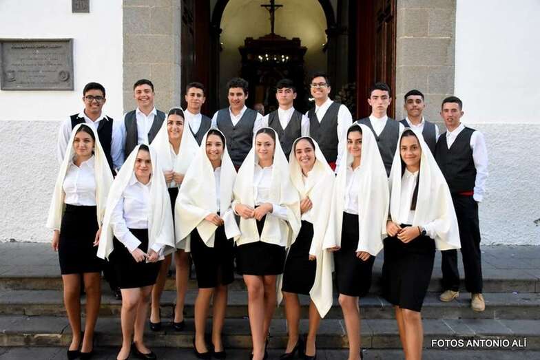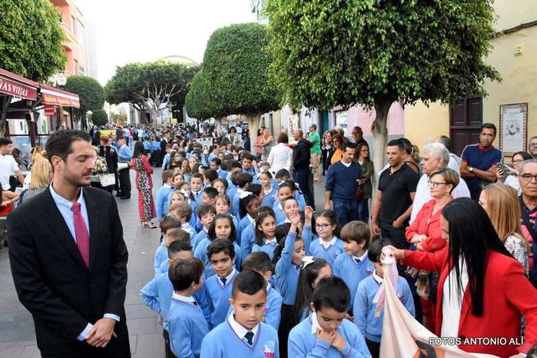 Muchos feligreses, autoridades y la Banda Municipal de Telde acompañaron el cortejo que abría un grupo de alumnos de ambos sexos y de antiguas alumnas ataviadas con mantilla española.