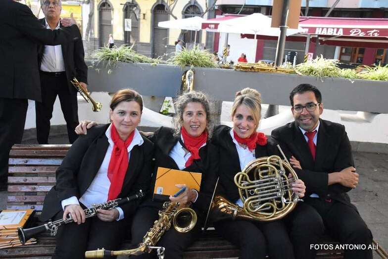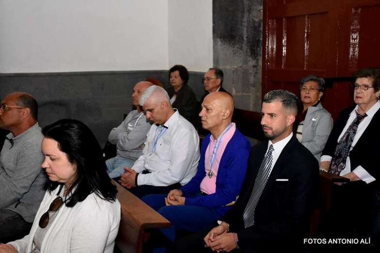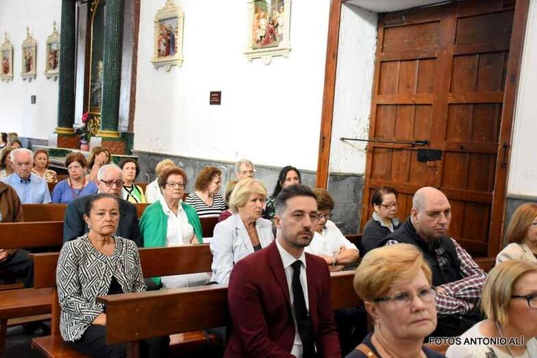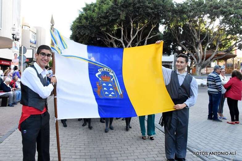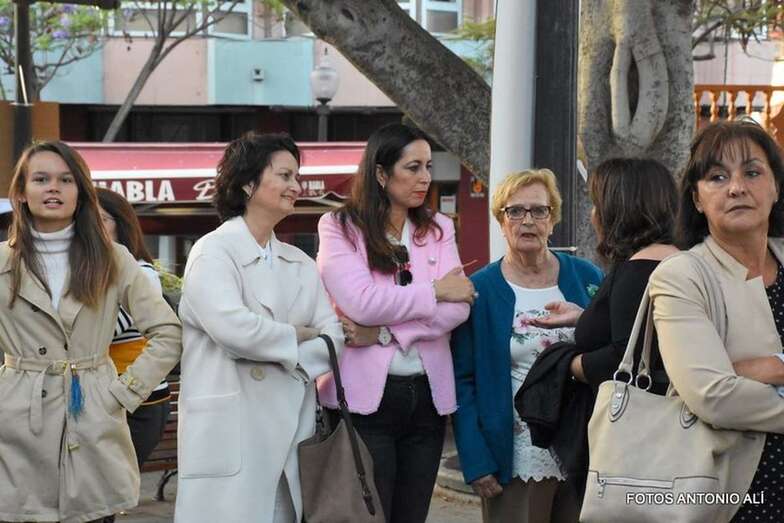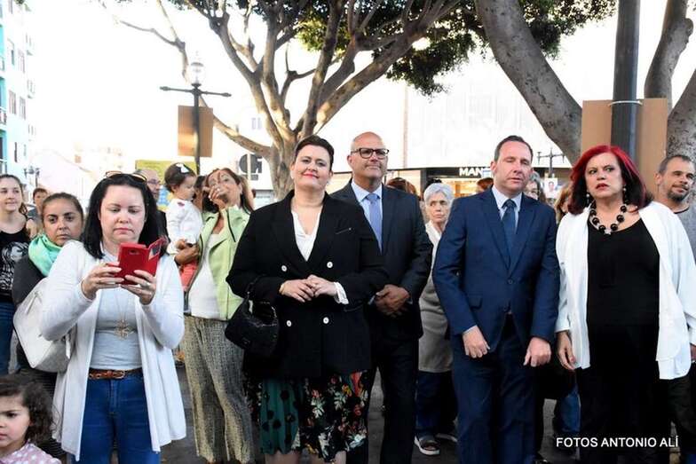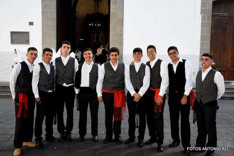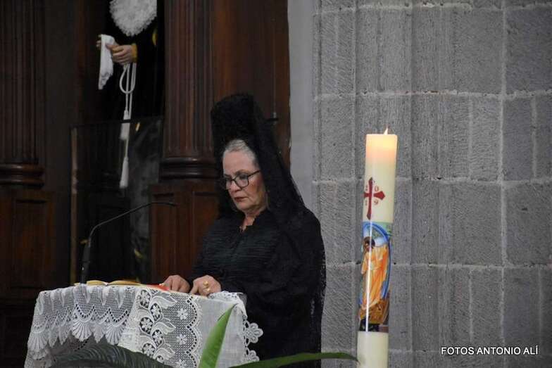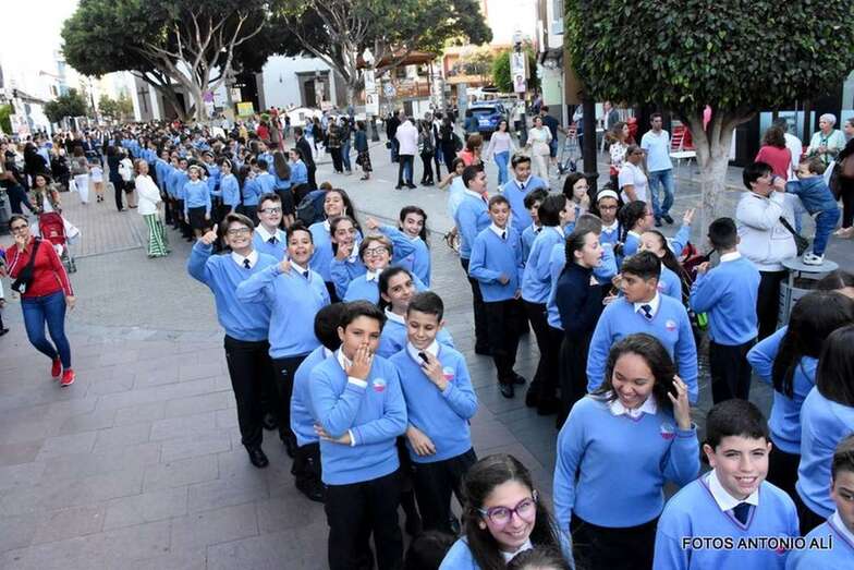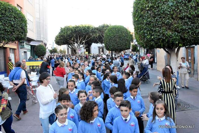 Muchos feligreses, autoridades y la Banda Municipal de Telde acompañaron el cortejo que abría un grupo de alumnos de ambos sexos y de antiguas alumnas ataviadas con mantilla española.