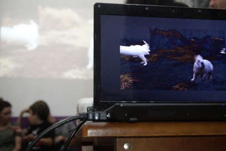 En una de las paredes del recinto se proyectaban diferentes vídeos en los que animales de granja, tales como vacas, pollos, cerdos y caballos jugaban con pelotas, corrían por los prados, acudían a la llamada de sus dueños y cosas muy curiosas y llamativas como abrir puertas o accionar bombas de agua para poder beber. Estas acciones, según el grupo 269, echan por tierra la creencia común de que los animales de granja son tontos. Es por ello deben ser respetados y tratados como por ejemplo a los perros y gatos, considerados socialmente como más inteligentes.