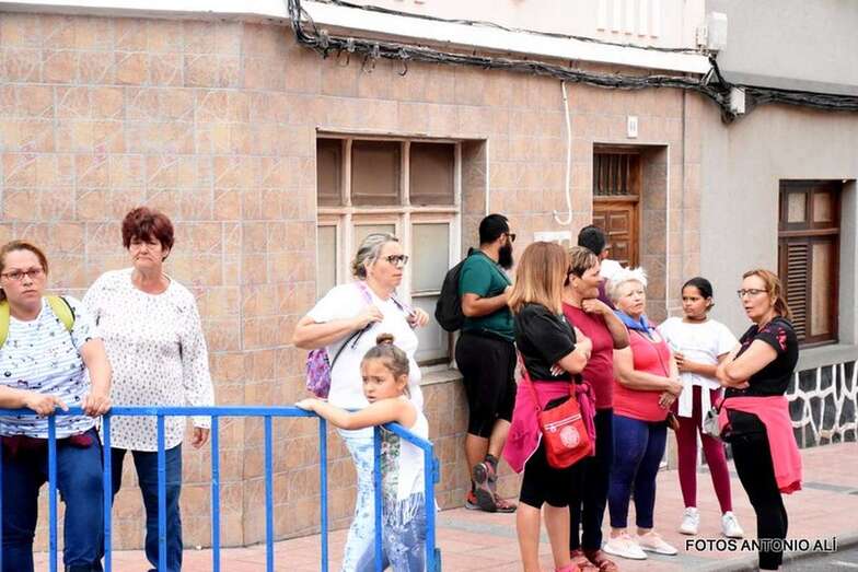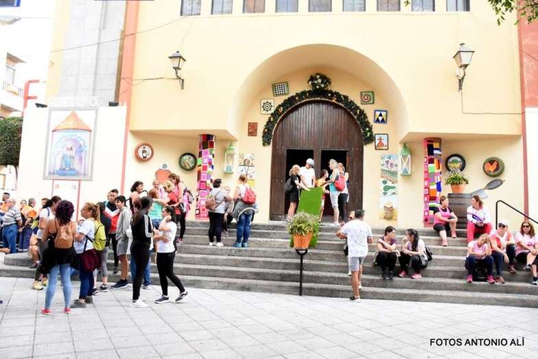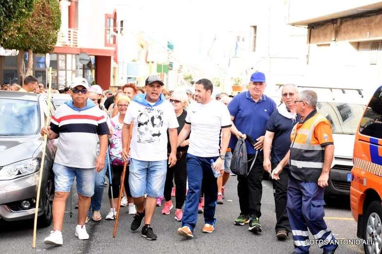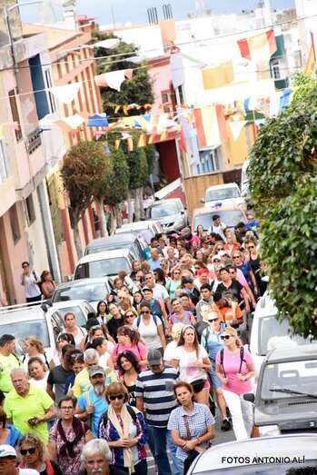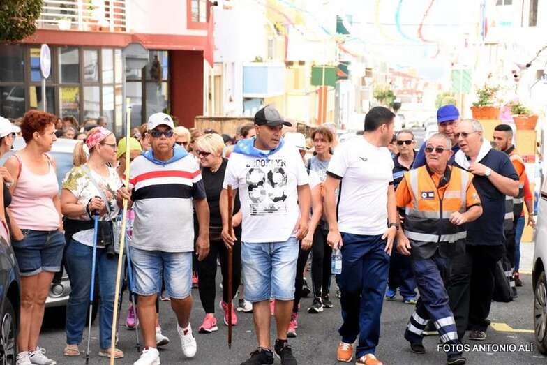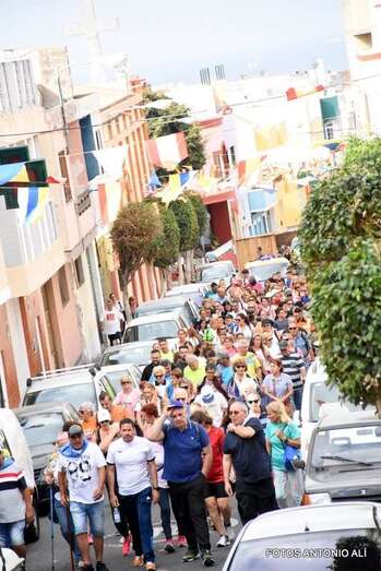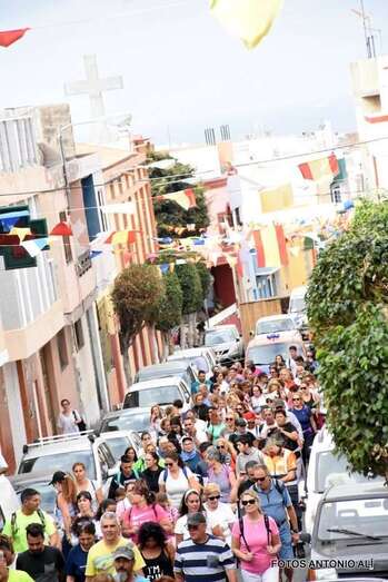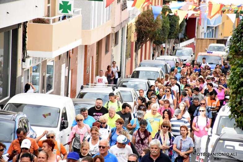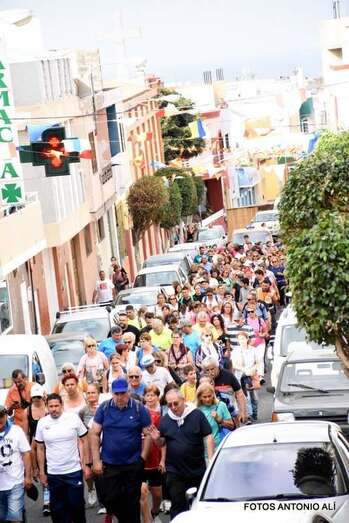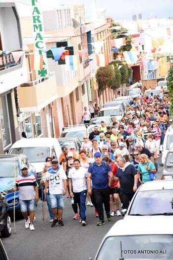La marea de peregrinos, a la que se sumaron, entre otros, el alcalde Héctor Suárez y el concejal Juan Martel, abandonó el barrio escoltada por la Policía Local y Protección Civil en dirección hacia el barranco de La Rocha para luego enfilar la larga recta de Lomo Cementerio.