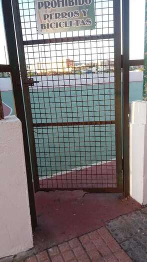 Telde.- La puerta de acceso a la cancha deportiva de Clavellinas sigue rota y oxidada, lo que no deja de ser un peligro para los menores y adolescentes que suelen utilizar este equipamiento municipal, remozado hace unos meses por el área de Deportes.