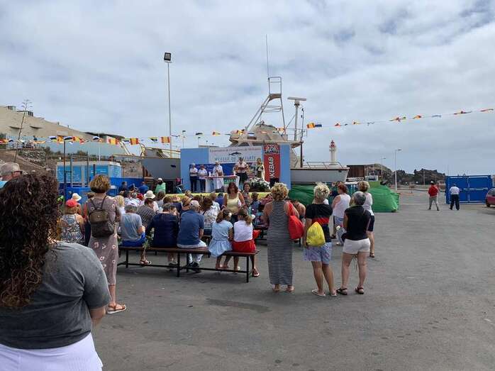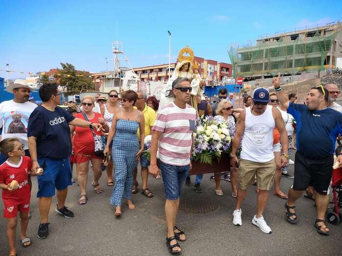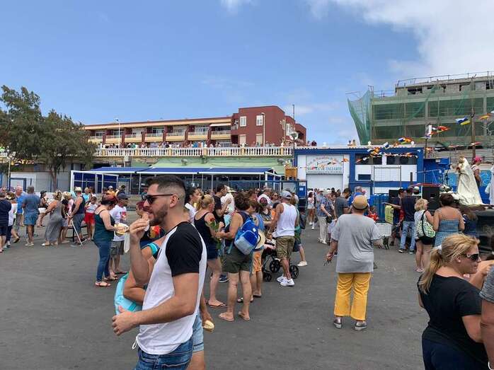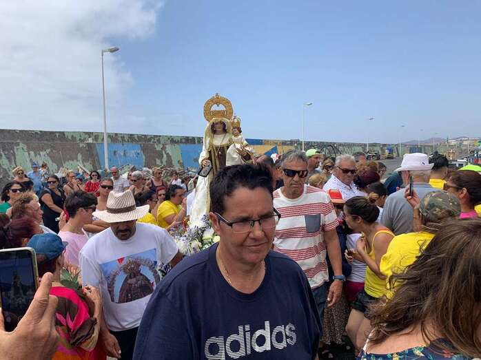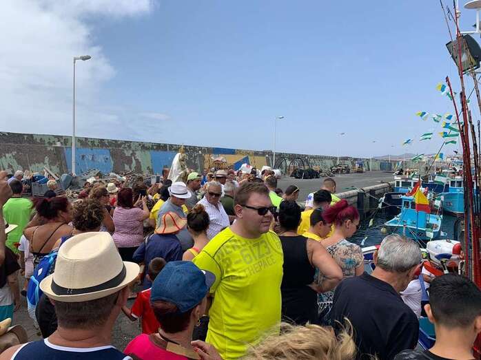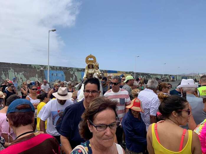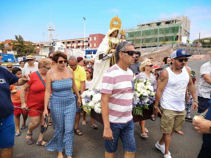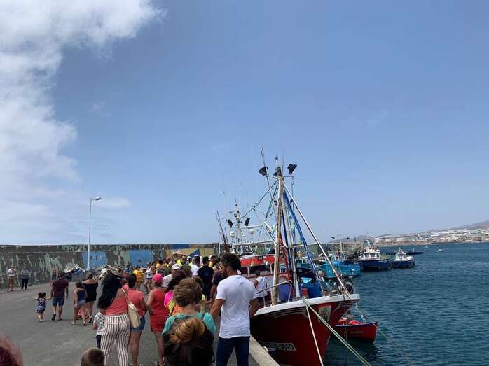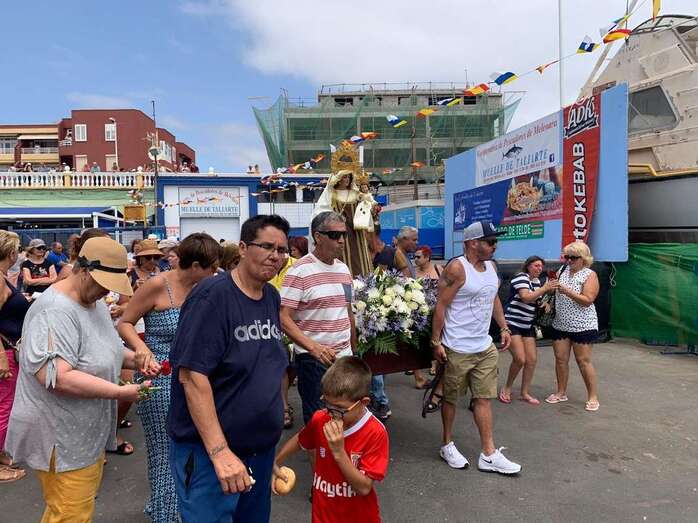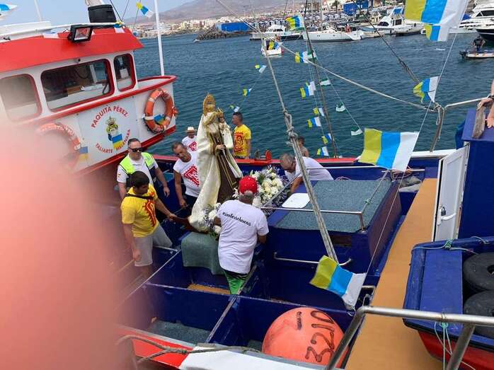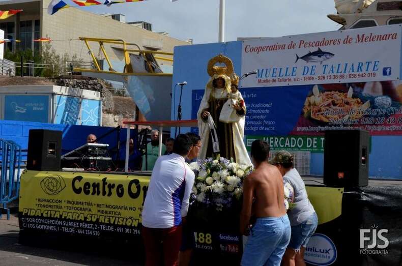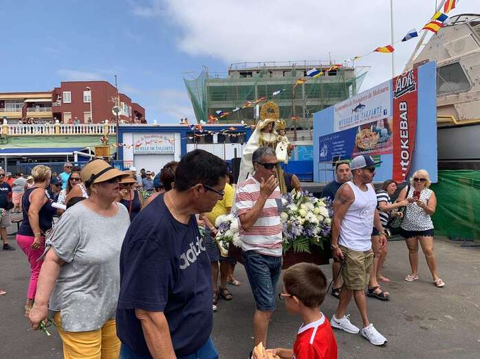 Decenas de personas asistieron a la misa previa, oficiada en la explanada del muelle pesquero y deportivo. Y a su finalización los vecinos trasladaron la imagen religiosa hasta el Paquita Pérez, uno de los barcos de la flota de Taliarte y Melenara que faenan en estas aguas.