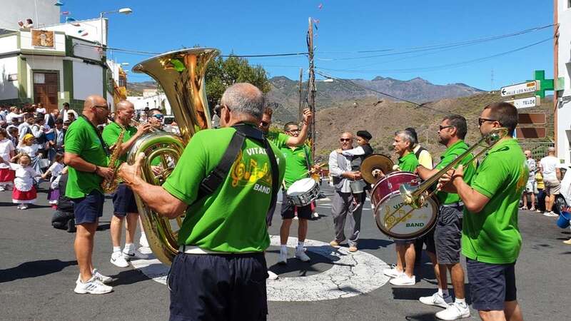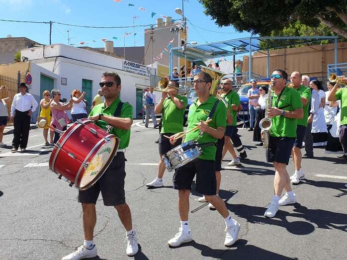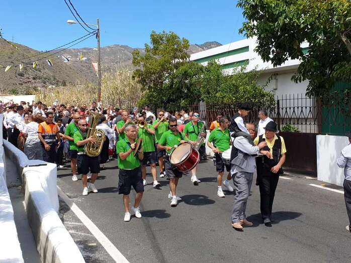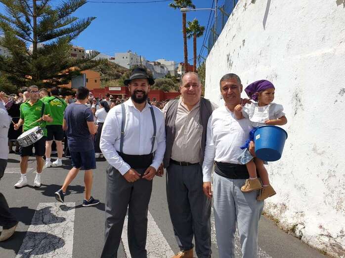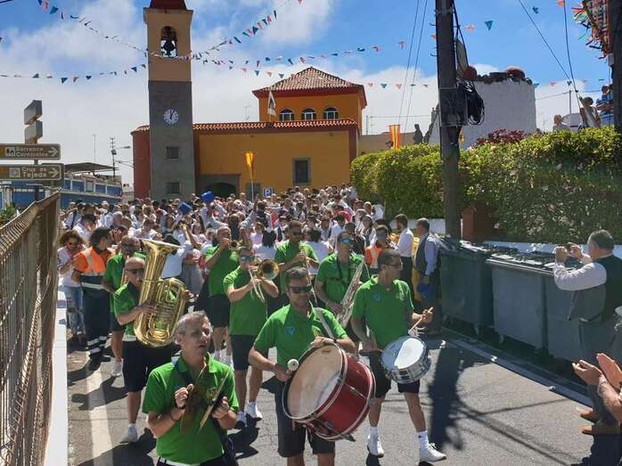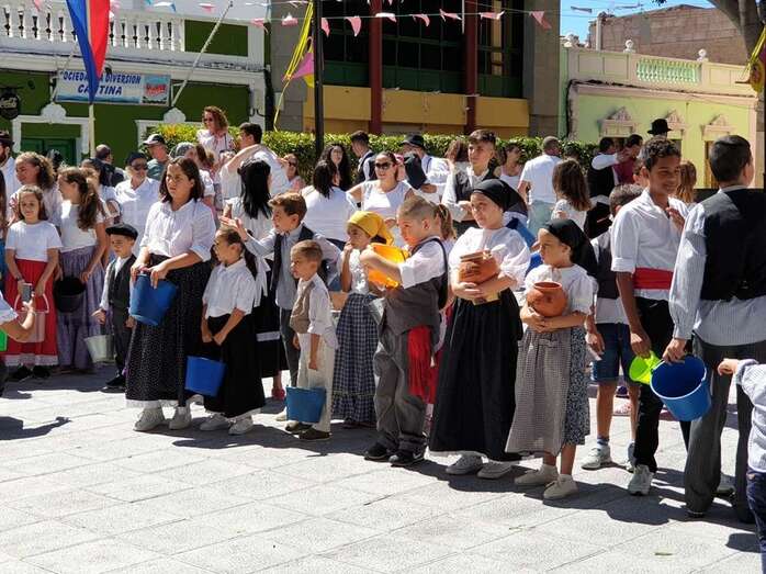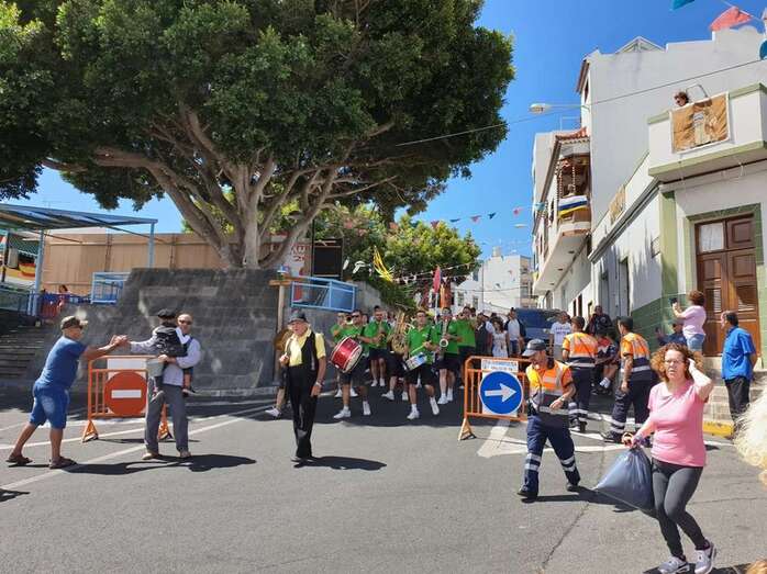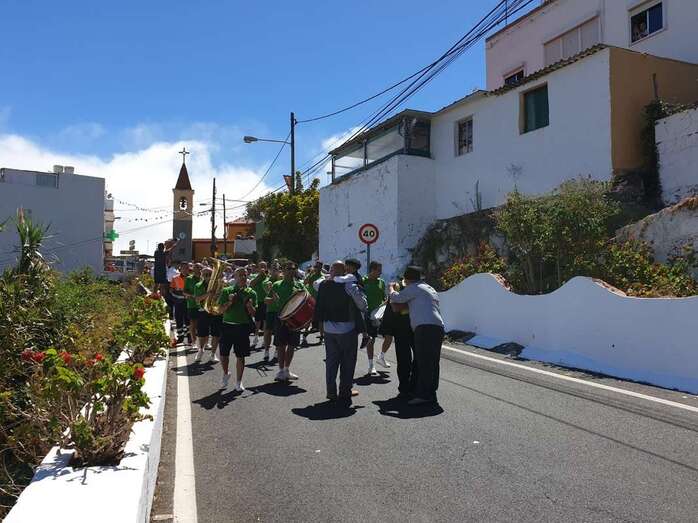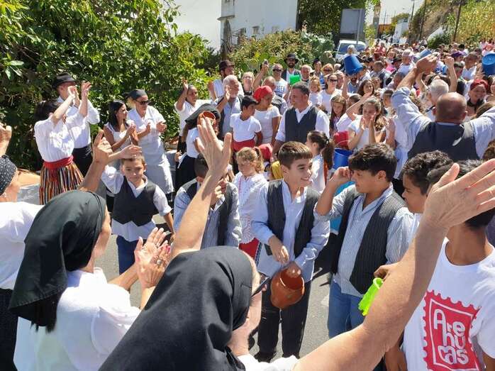 A partir de ese momento, la banda Vitamina marcó el paso de la comitiva de niños y sus padres y madres hasta el lugar de la carretera general de Lomo Magullo donde, una vez más, estalló la batalla del agua cogida con baldes y cubos en la remozada acequia de la Heredad del Valle, donde se descubrió una placa conmemorativa de las obras ejecutadas en presencia de varias ediles del Gobierno de Telde, entre ellos Juan Martel, Jonay López y Servando González, que compartieron con la chiquillería esta divertida fiesta.