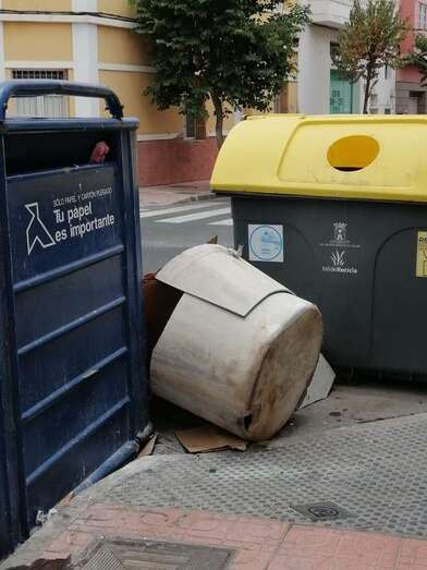 Bidón junto a depósitos para la recogida de cartón y envases de plásticos Bidón junto a depósitos para la recogida de cartón y envases de plásticos
