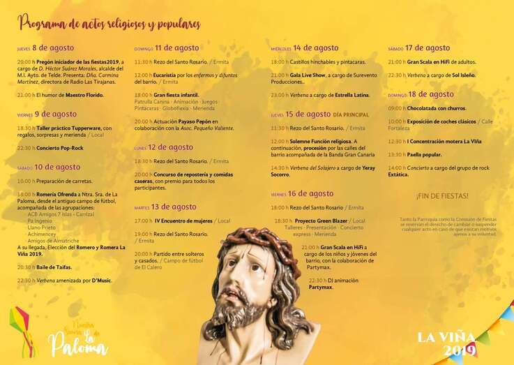Telde.- El barrio de La Viña celebrará sus fiestas patronales en honor de Nuestra Señora de La Paloma del 8 al 18 agosto. Unos festejos que comenzarán con el pregón del alcalde de Telde, Héctor Suárez.