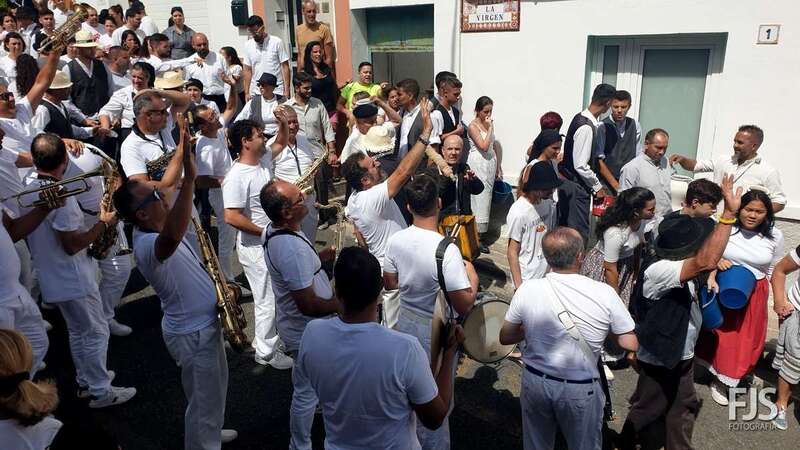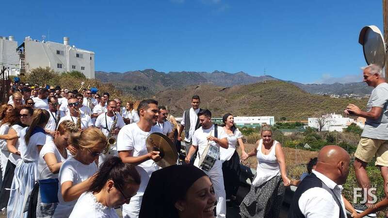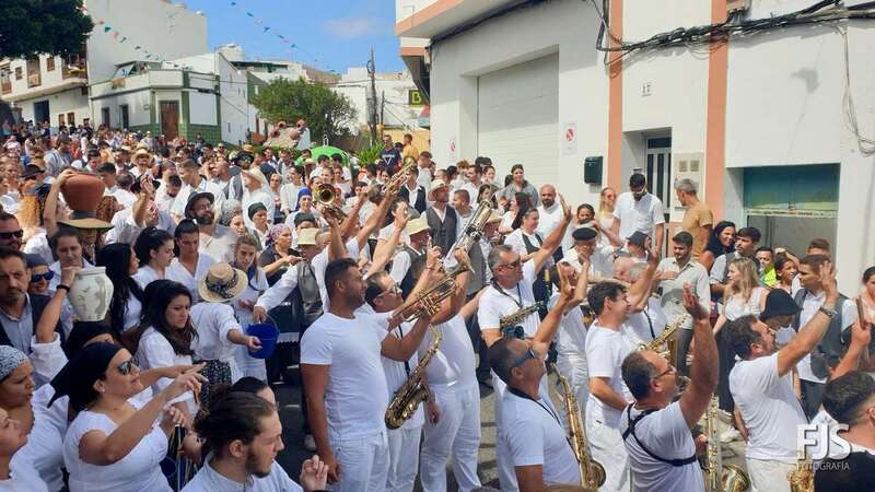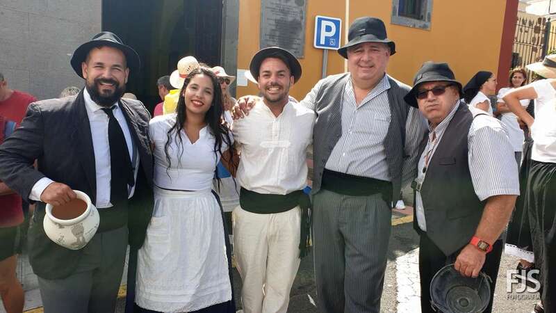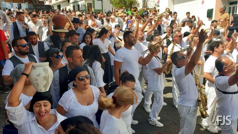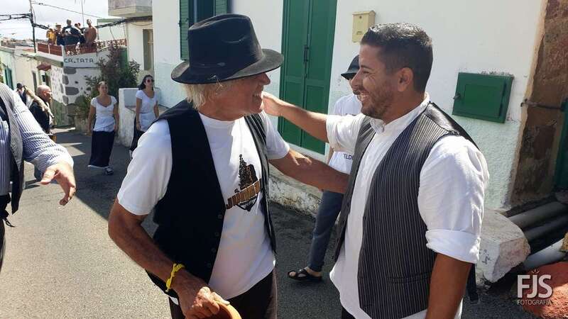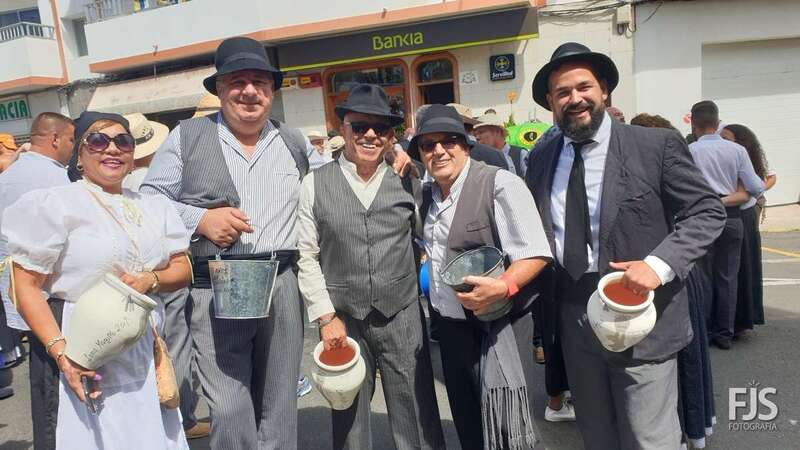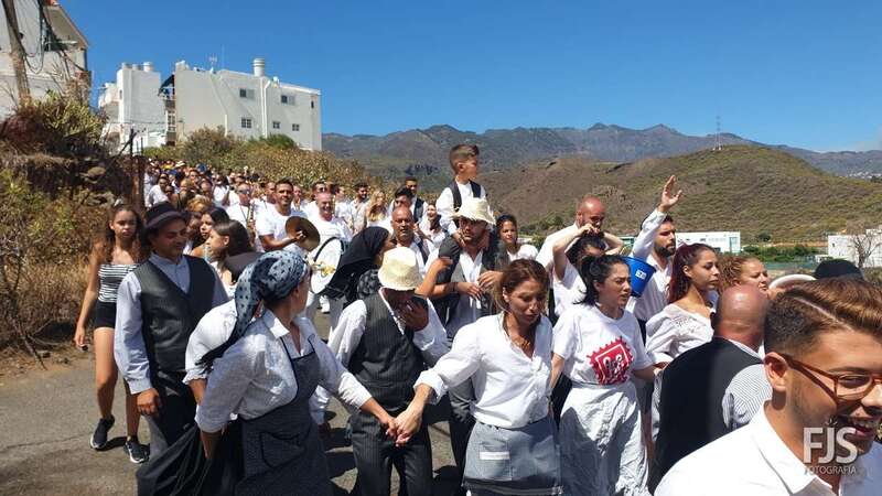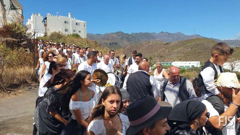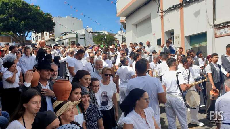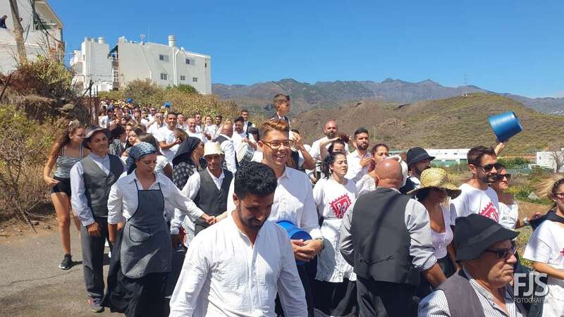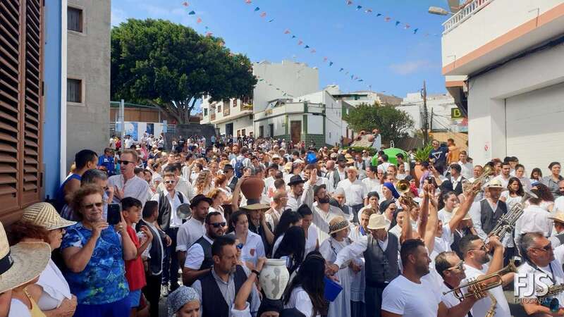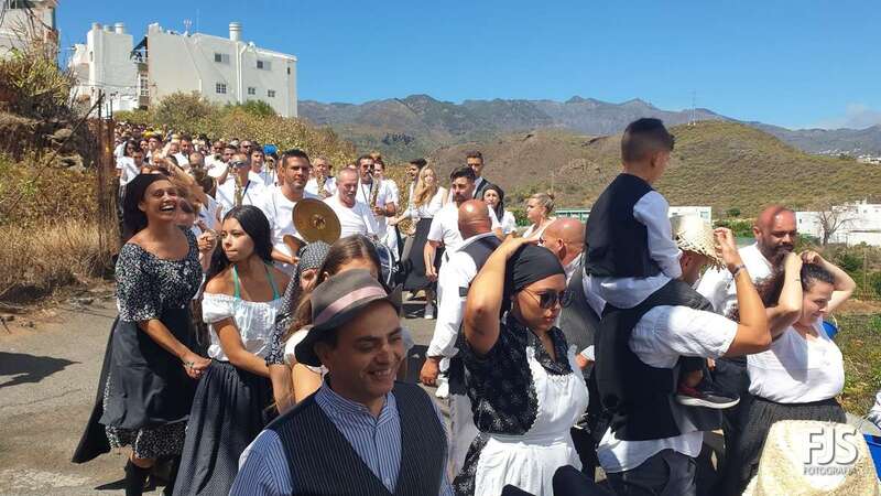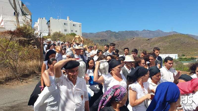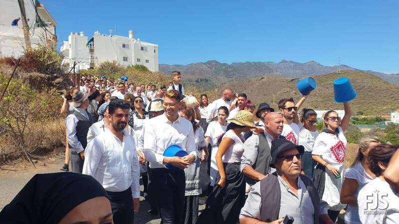 El gentío bajó como es costumbre desde el entorno del templo de Las Nieves por la calle de la Virgen en cuanto se oyó el chupinazo del volador que anunciaba a las 12 del mediodía el inicio de esta popular manifestación festiva. Entre los participantes, varios ediles de la Corporación municipal y el cura párroco de Lomo Magullo y pagos próximos, Fernando Báez, que nunca falta a esta cita.