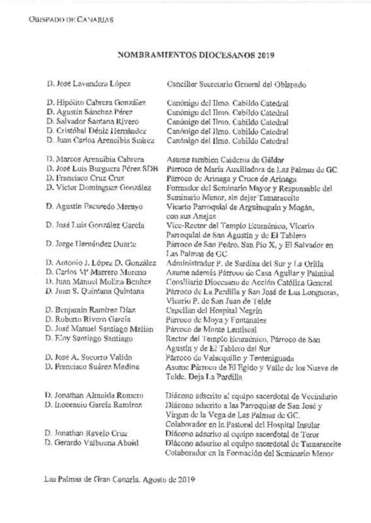 Nombramientos de la Diócesis de Canarias para el curso 2019-2020.