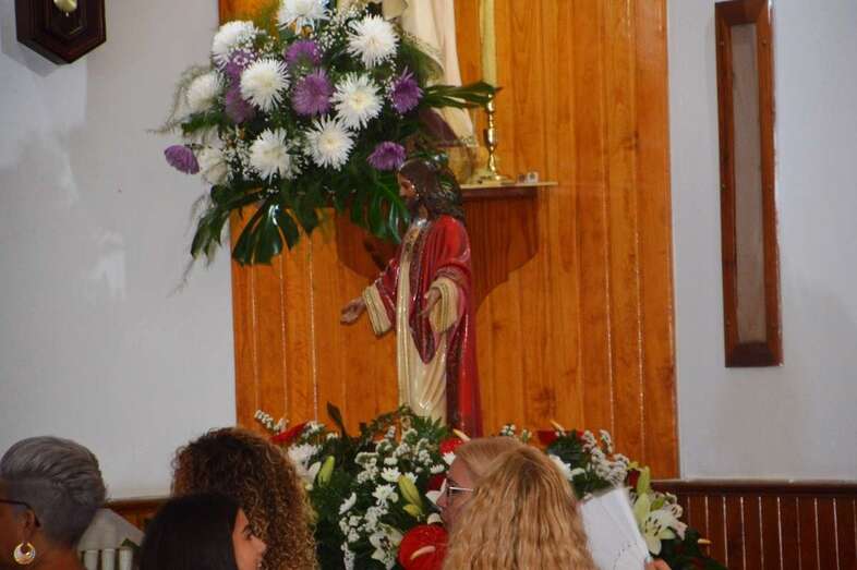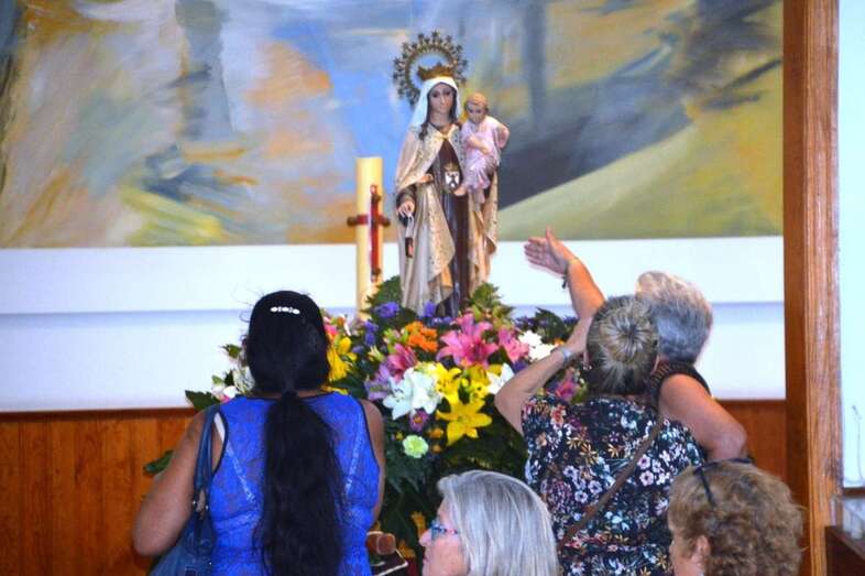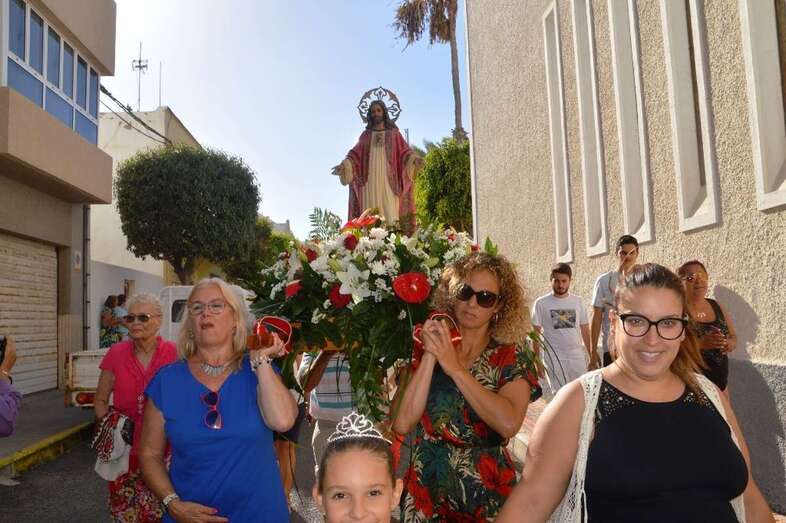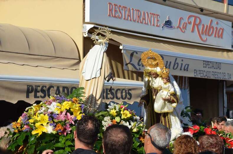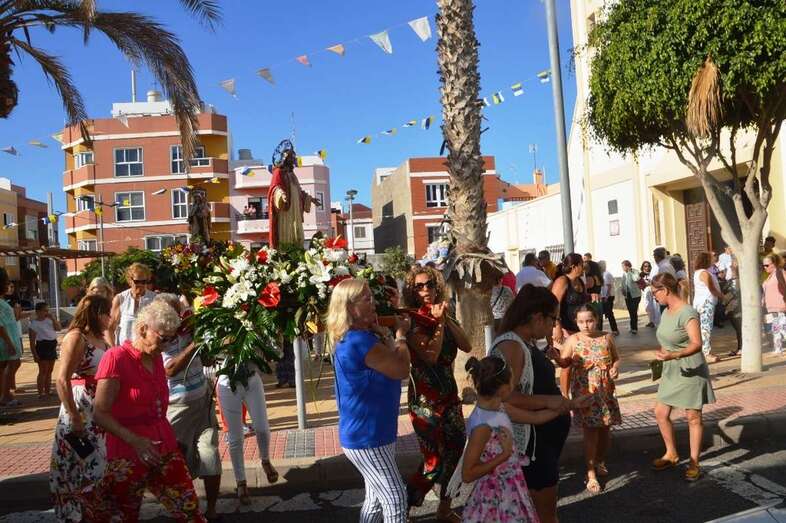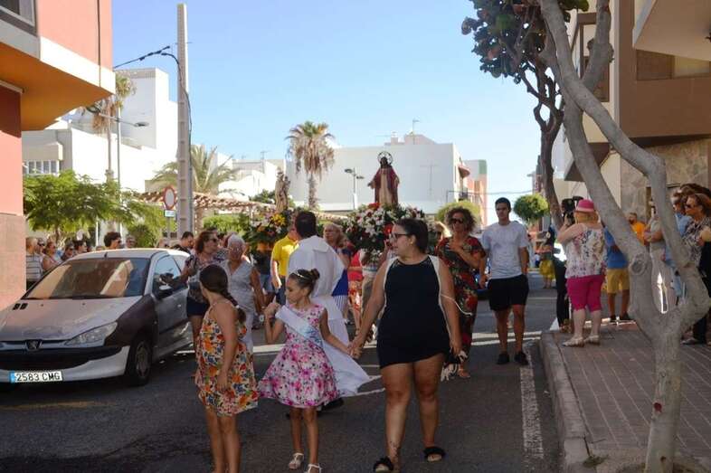 La comitiva religiosa, acompañada por numerosos fieles, efectuó el trayecto habitual por la arena y calles de esta playa, donde la Virgen del Carmen, el Corazón de Jesús y el Santo Cura de Ars fueron acogidos con aplausos, vivas, despliegue de banderas españolas y una atronadora exhibición de fuegos artificiales a la altura de La Barranquera, en su vuelta al templo de Clavellinas, donde se oficiará una misa por los difuntos de la zona.