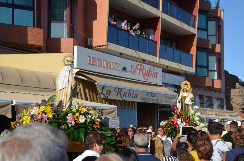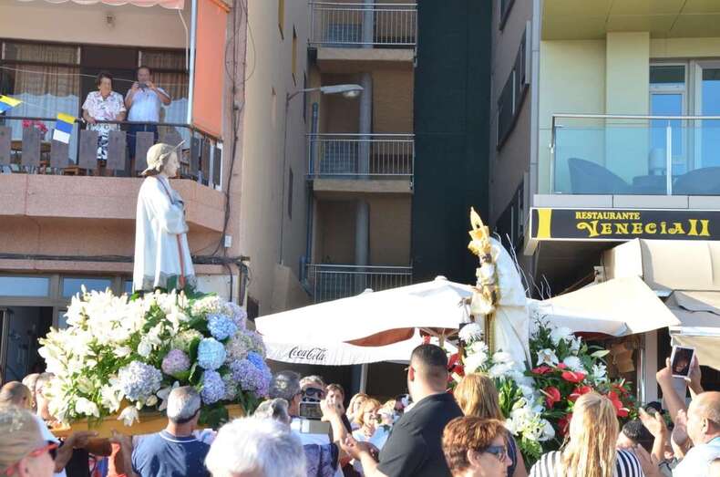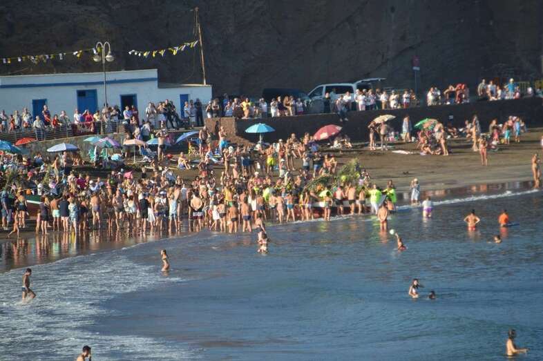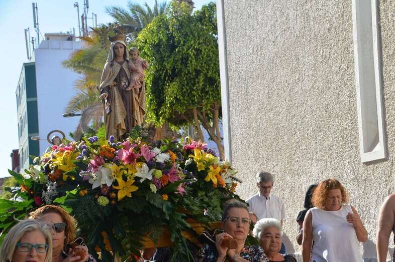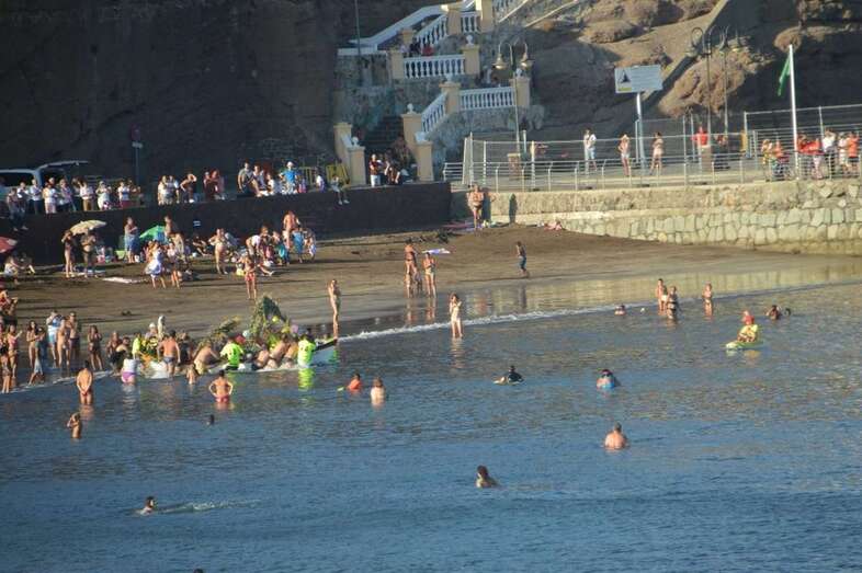 Después de un recorrido por la avenida de Melenara, la procesión enfilo el sector viejo de esta playa donde fue saludada por varias descargas de voladores y los vivas del público. Poco a poco, las imágenes se fueron acercando hasta la arena de la playa, en donde les esperaban las tres embarcaciones de pescadores que las pasearían a partir de las 19.00 horas por el litoral de Melenara, Taliarte, Claveillas y Salinetas.