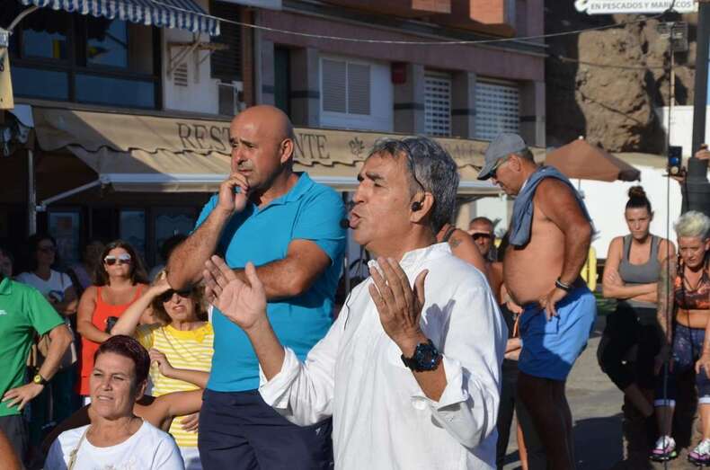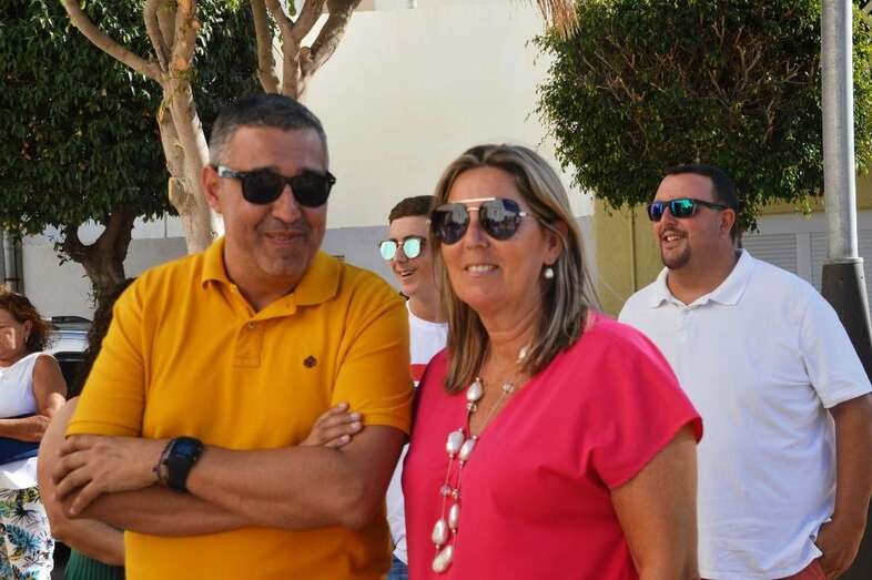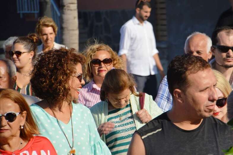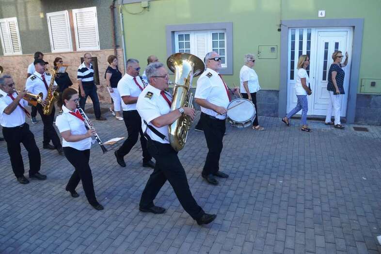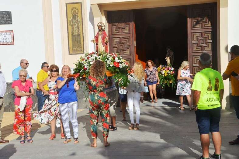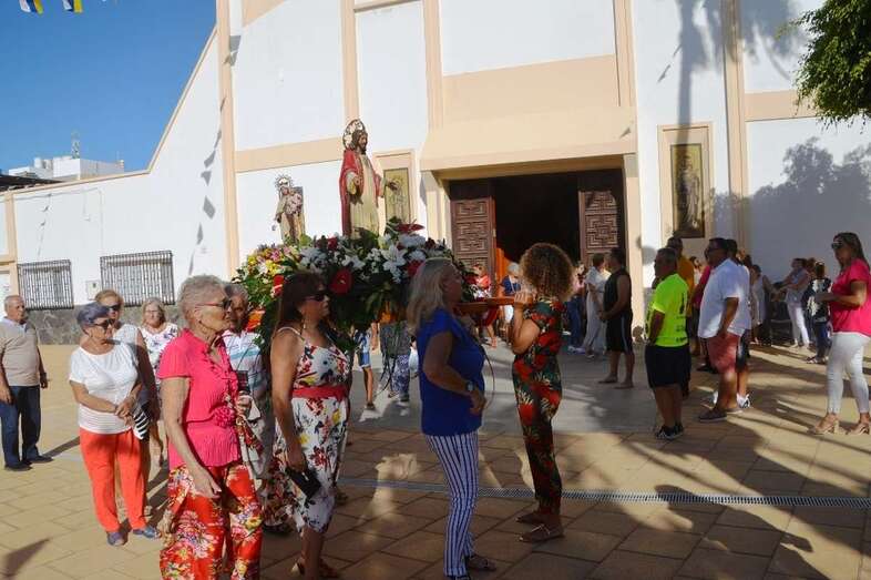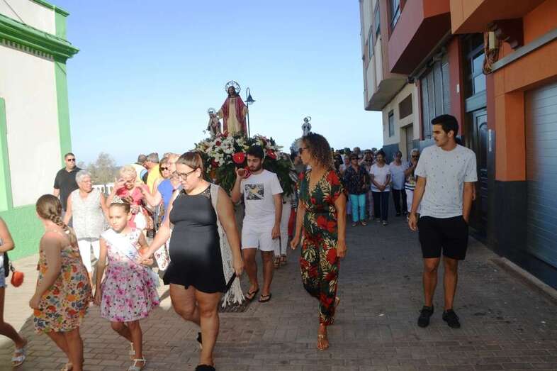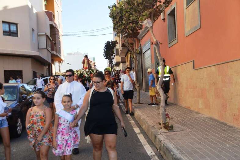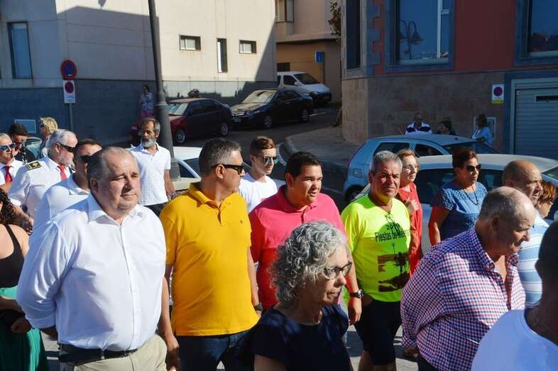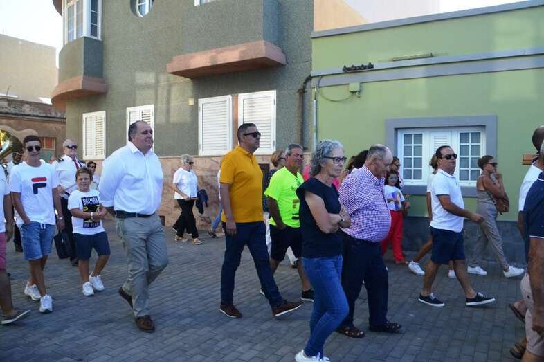 El desfile religioso se inició con los tronos portados a hombro por vecinos de Melenara. A la puerta del templo de Clavellinas, las imágenes eran recibidas por la feligresía y por una pequeña representación de autoridades municipales conformada por los ediles Juan Martel y Servando González, a la que luego se sumará la concejala María Eugenia Melián, ya en Salinetas.