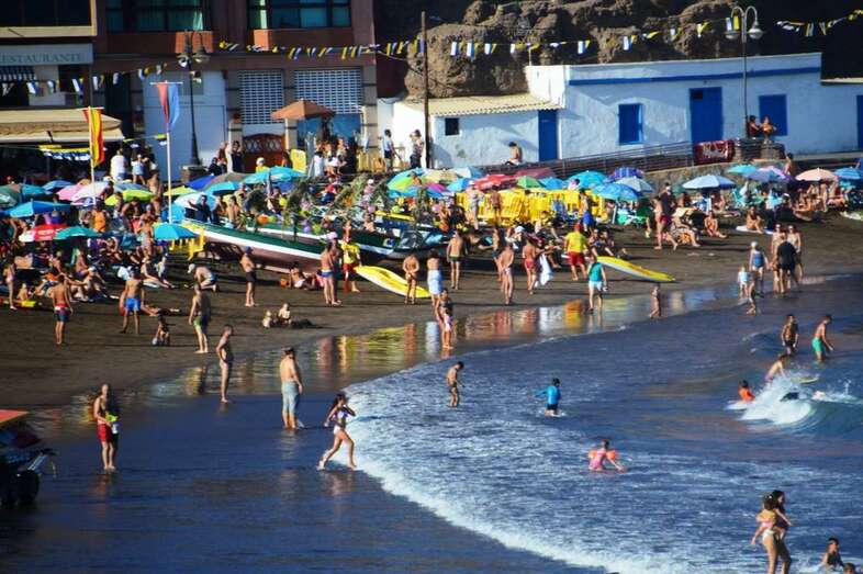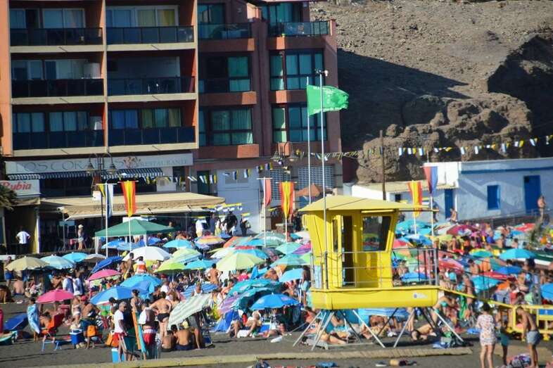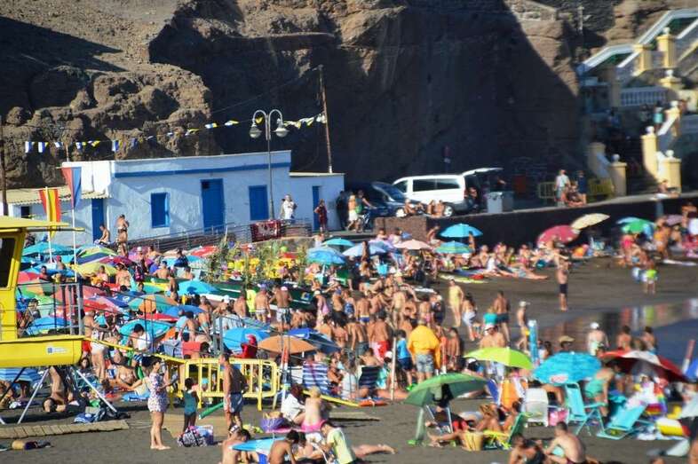 Una multitud de personas se aglutinó en las playas y avenidas que bordean la bahía de Melenara para seguir y acompañar el recorrido terrestre y la travesía por mar de los tres barcos de pescadores a remo que portaban las imágenes de los patronos de la zona, a los que sumaron varias embarcaciones de recreo.