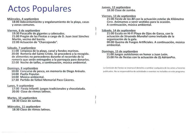 Las fiestas se prolongarán hasta el domingo 15 de septiembre y el programa prevé, entre otras actividades, una limpieza de la playa, canal y fondos marinos, la romería del próximo sábado (7 de septiembre), concurso de pesca, partido de fútbol en memoria de Paco Cáceres, clases de zumba y ritmos latinos, escala en hifi, fiestas infantiles y la quema de fuegos artificiales.