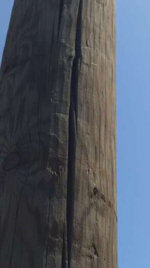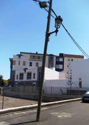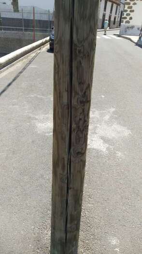 El madero está clavado en el asfalto, soporta una farola de diseño antiguo y un foco y presenta fisuras en su recorrido longitudinal que agrava el temor ciudadano a que pueda desplomarse en cualquier momento, en una zona usada a diario como aparcamiento de vehículos y muy transitada por personas.